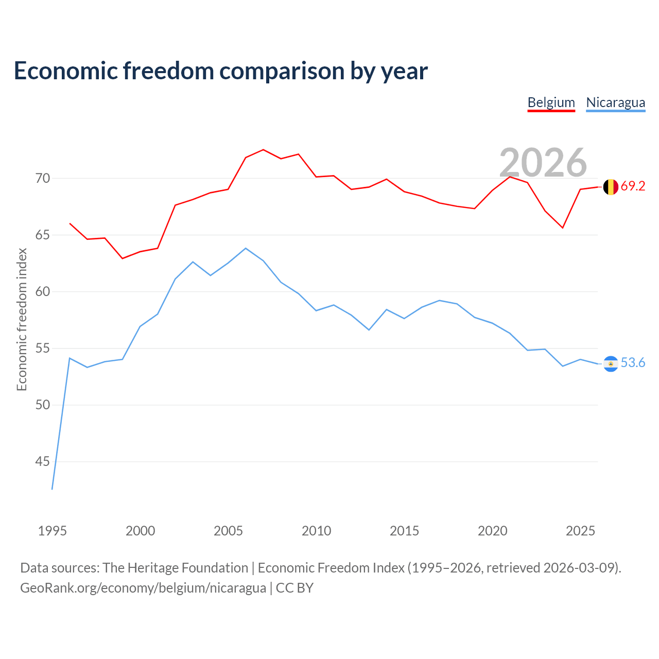 The Economic Freedom Index for Belgium is 69.2, ranking 42/197, compared to 53.6 for Nicaragua, ranking 139/197. The chart above displays a comparison of annual changes in economic freedom indexes.