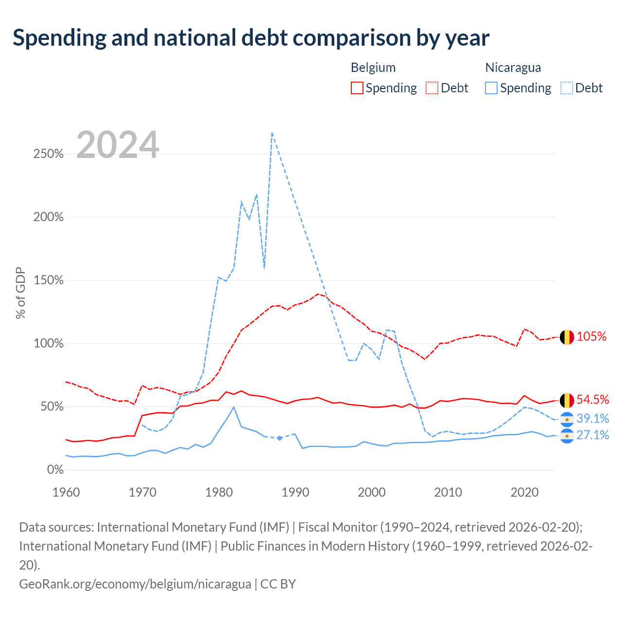 Belgium has $703B in government debt (104.7% of GDP), compared to $7.71B (39.1% of GDP) in Nicaragua.