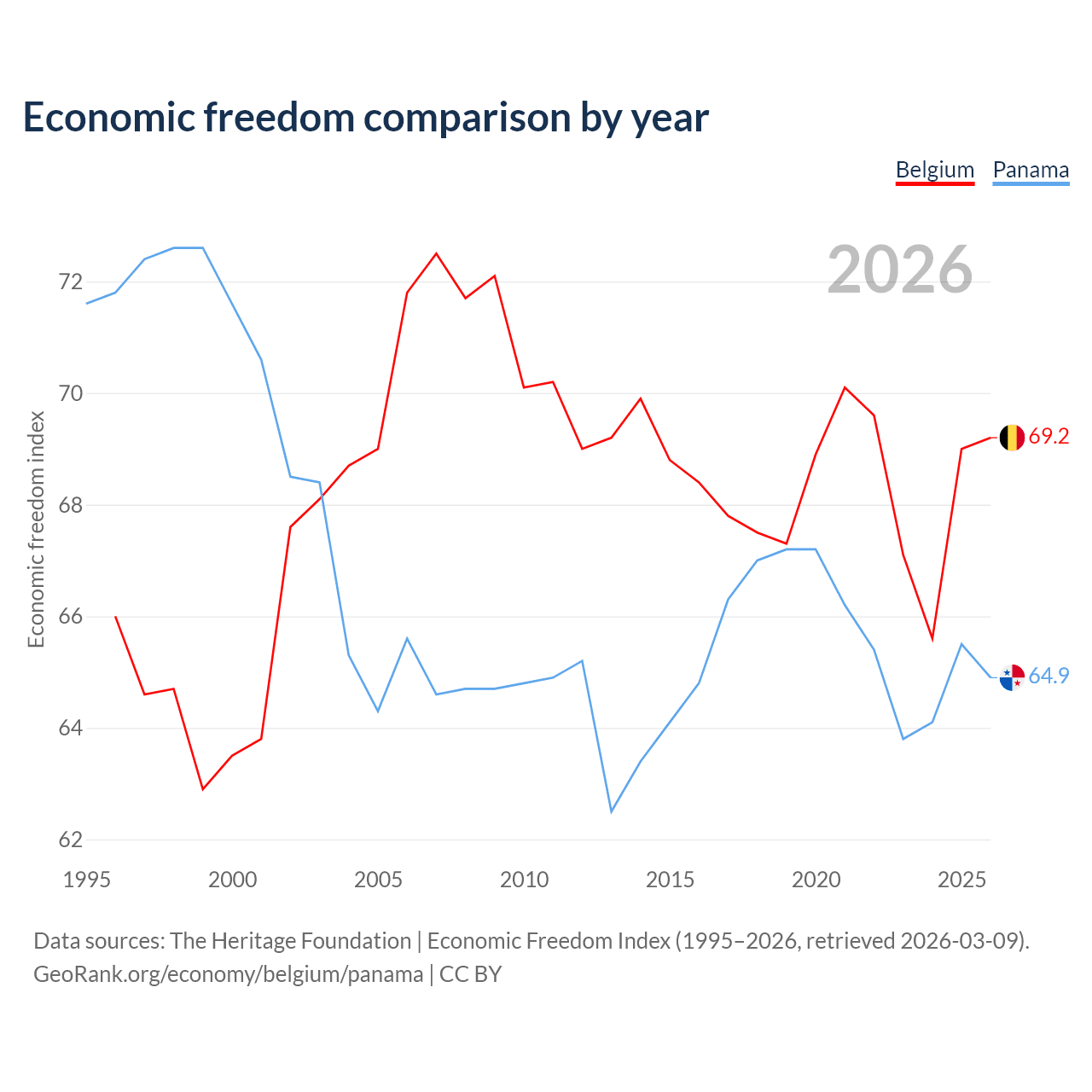The Economic Freedom Index for Belgium is 69.2, ranking 42/197, compared to 64.9 for Panama, ranking 70/197. The chart above displays a comparison of annual changes in economic freedom indexes.