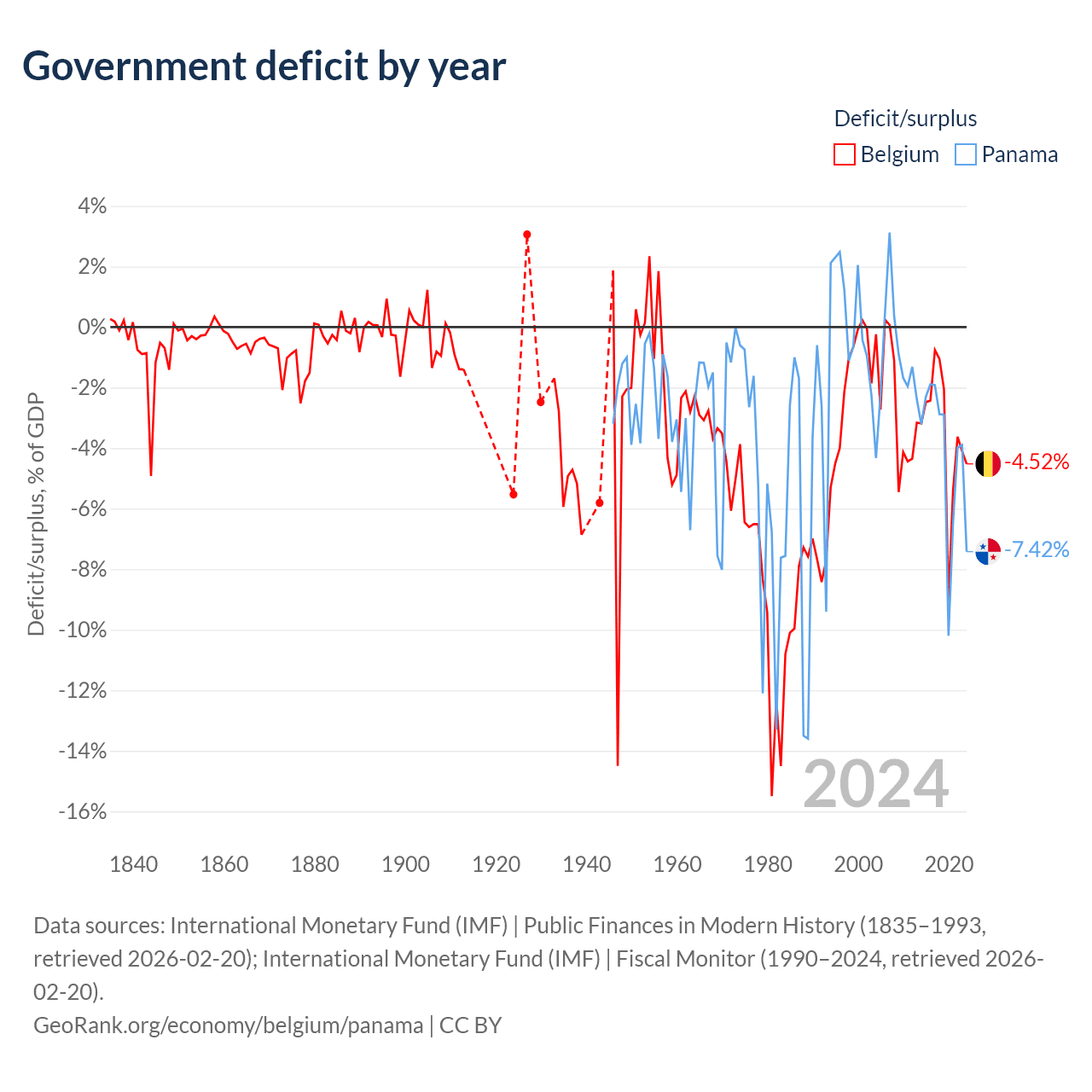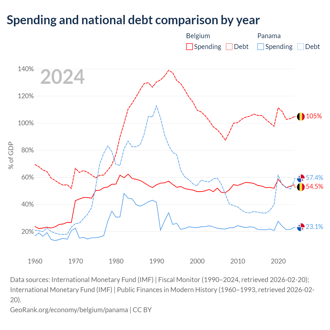 Belgium has $703B in government debt (104.7% of GDP), compared to $49.6B (57.4% of GDP) in Panama.