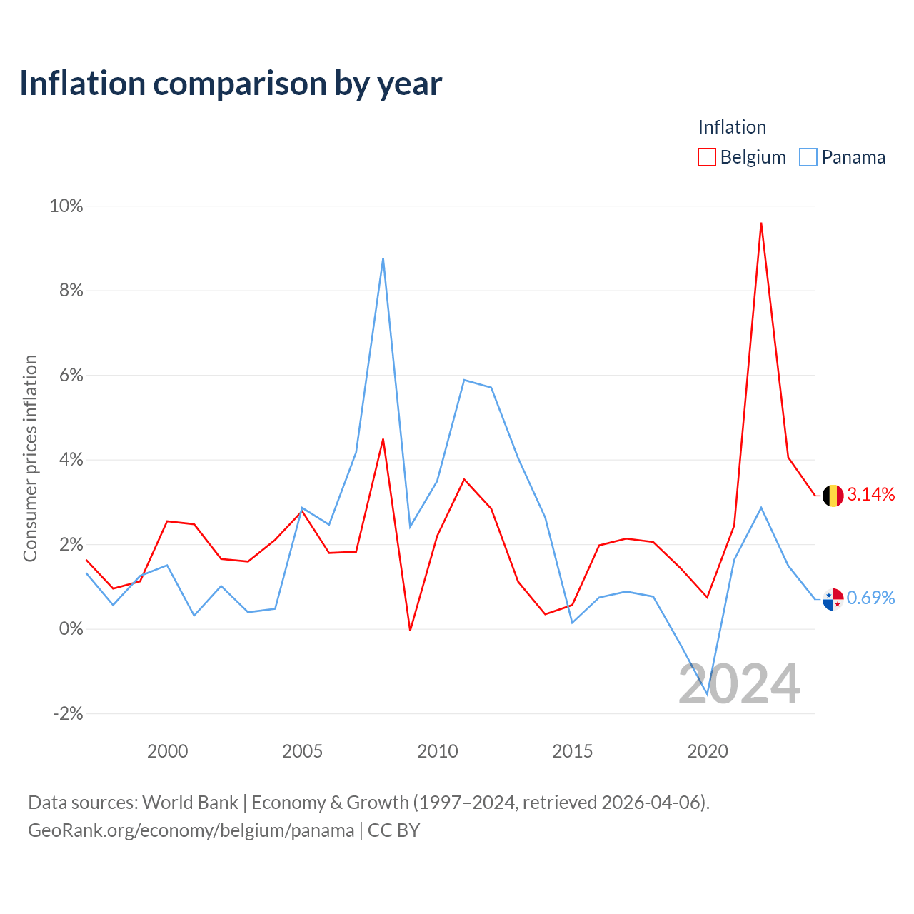Belgium has a GDP of $671B compared to $86.5B for Panama, ranking 23/197 and 78/197 by economy size, respectively.
