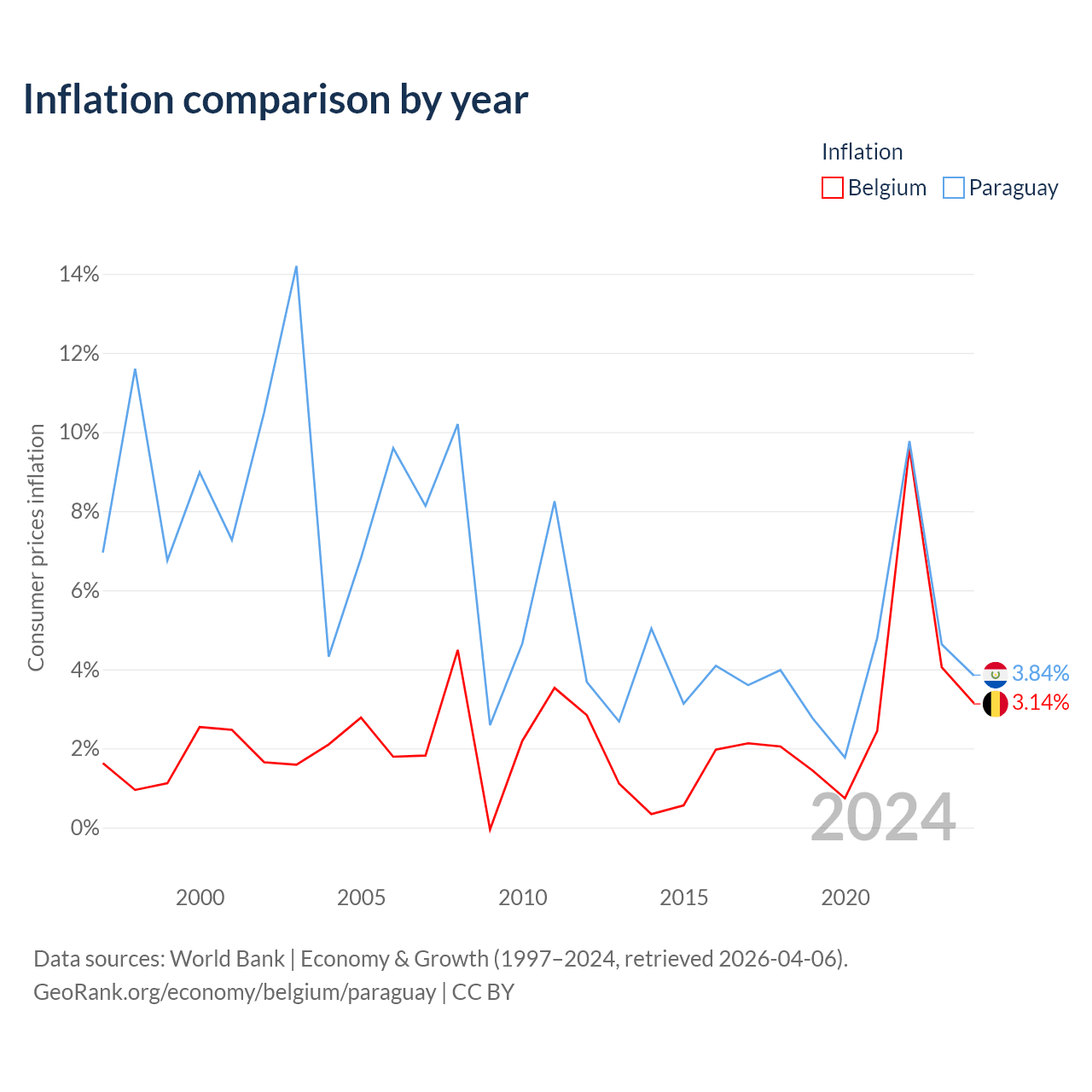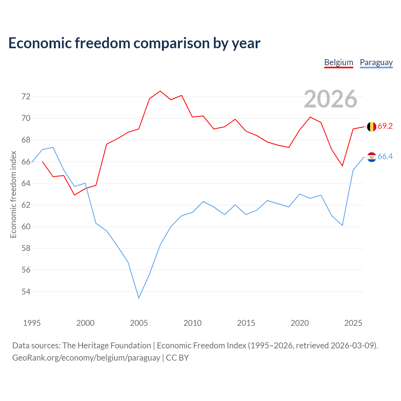The Economic Freedom Index for Belgium is 69.2, ranking 42/197, compared to 66.4 for Paraguay, ranking 61/197. The chart above displays a comparison of annual changes in economic freedom indexes.