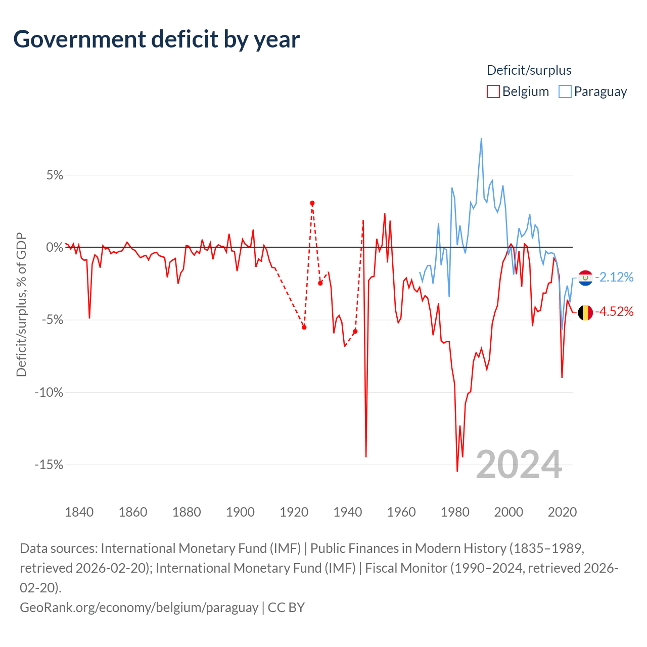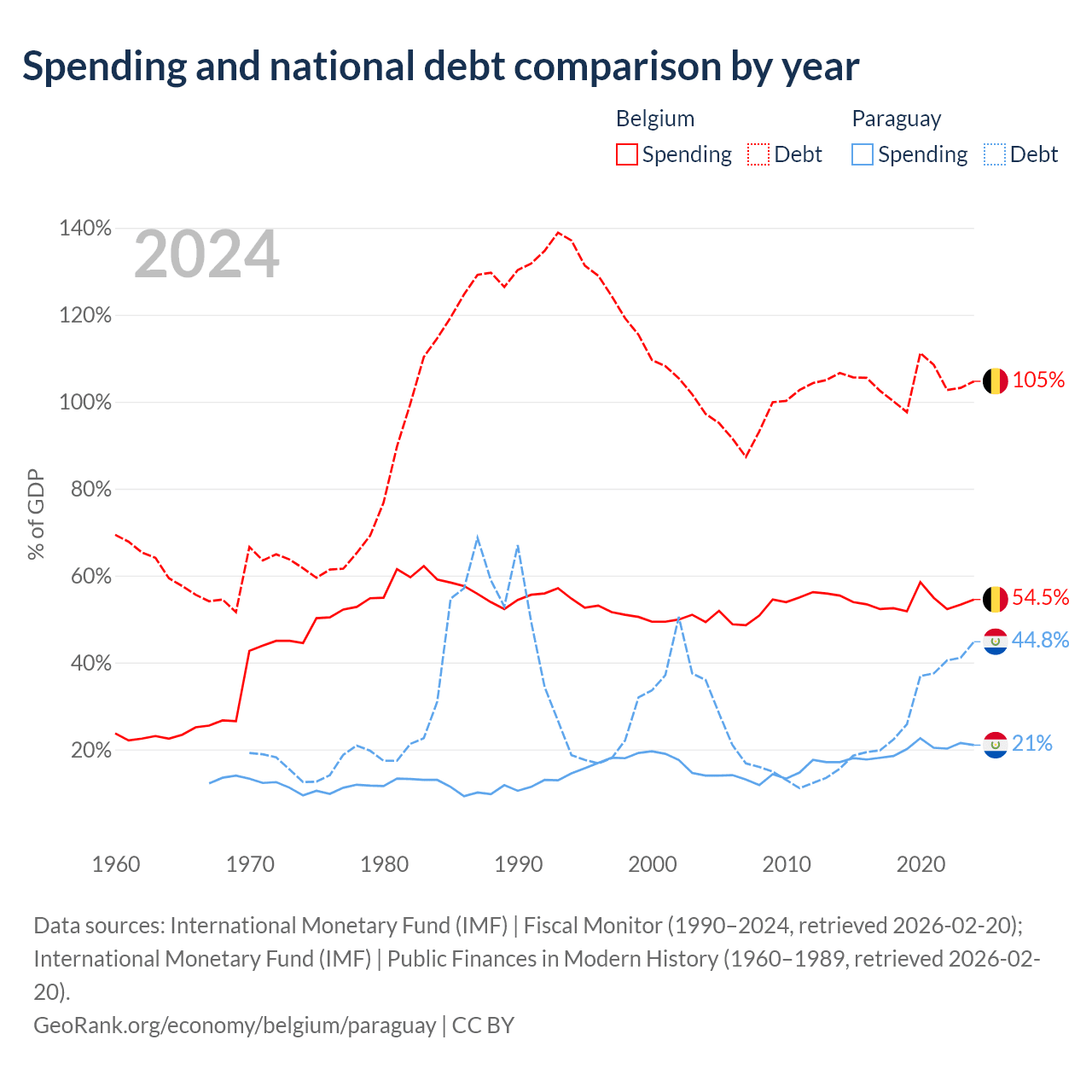 Belgium has $703B in government debt (104.7% of GDP), compared to $19.9B (44.8% of GDP) in Paraguay.
