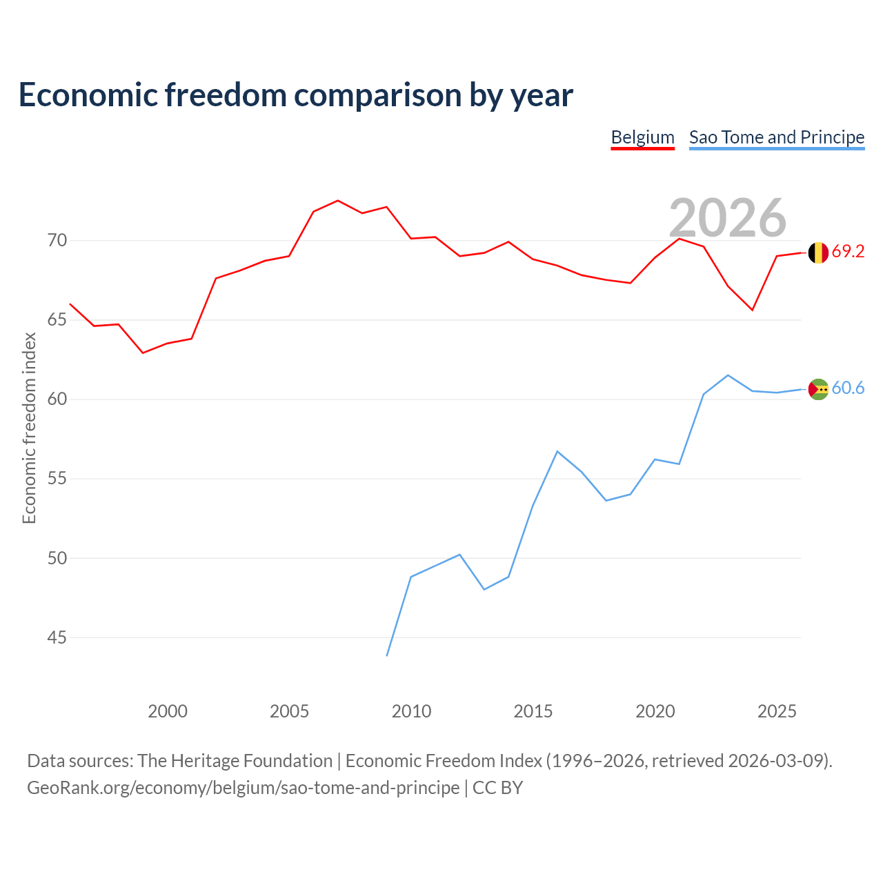 The Economic Freedom Index for Belgium is 69.2, ranking 42/197, compared to 60.6 for Sao Tome and Principe, ranking 93/197. The chart above displays a comparison of annual changes in economic freedom indexes.