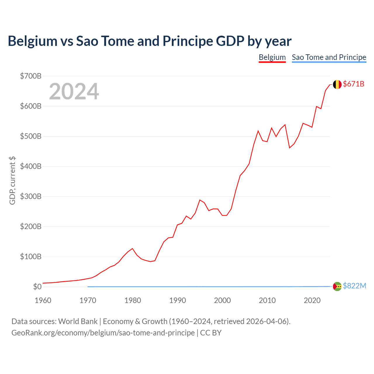 Belgium has a GDP of $671B compared to $822M for Sao Tome and Principe, ranking 23/197 and 189/197 by economy size, respectively.