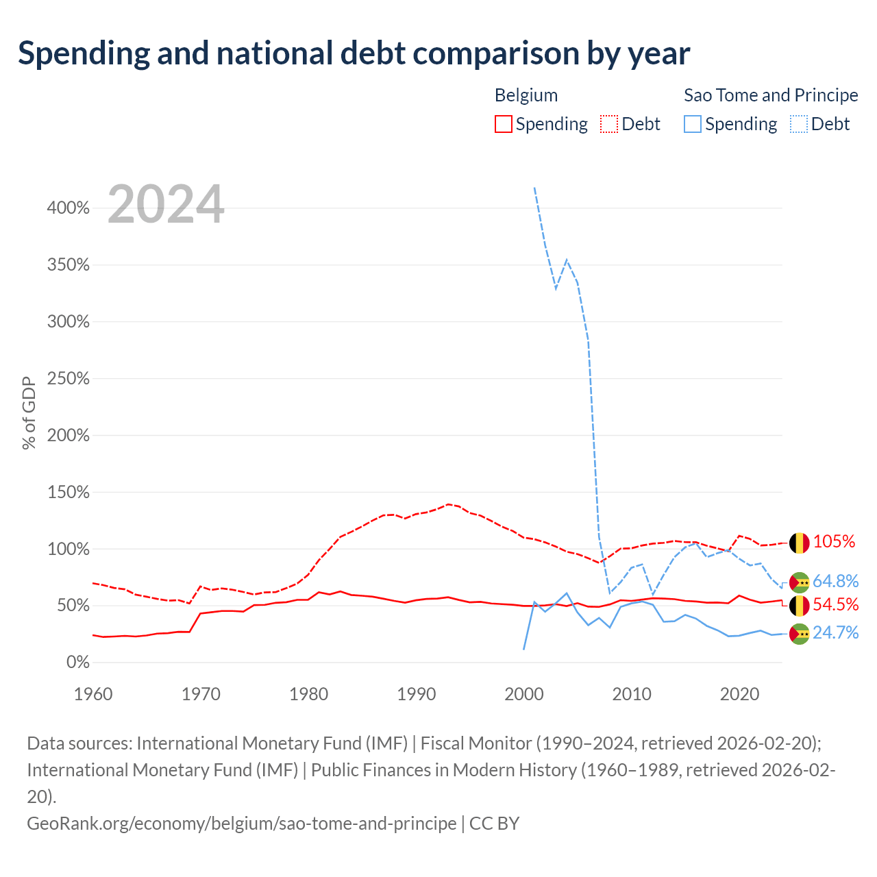 Belgium has $703B in government debt (104.7% of GDP), compared to $533M (64.8% of GDP) in Sao Tome and Principe.