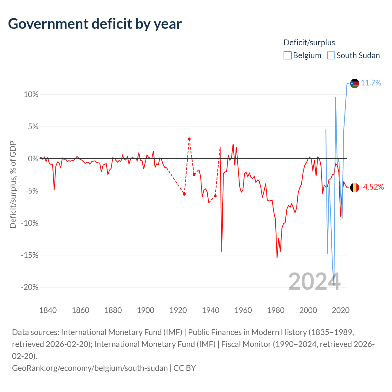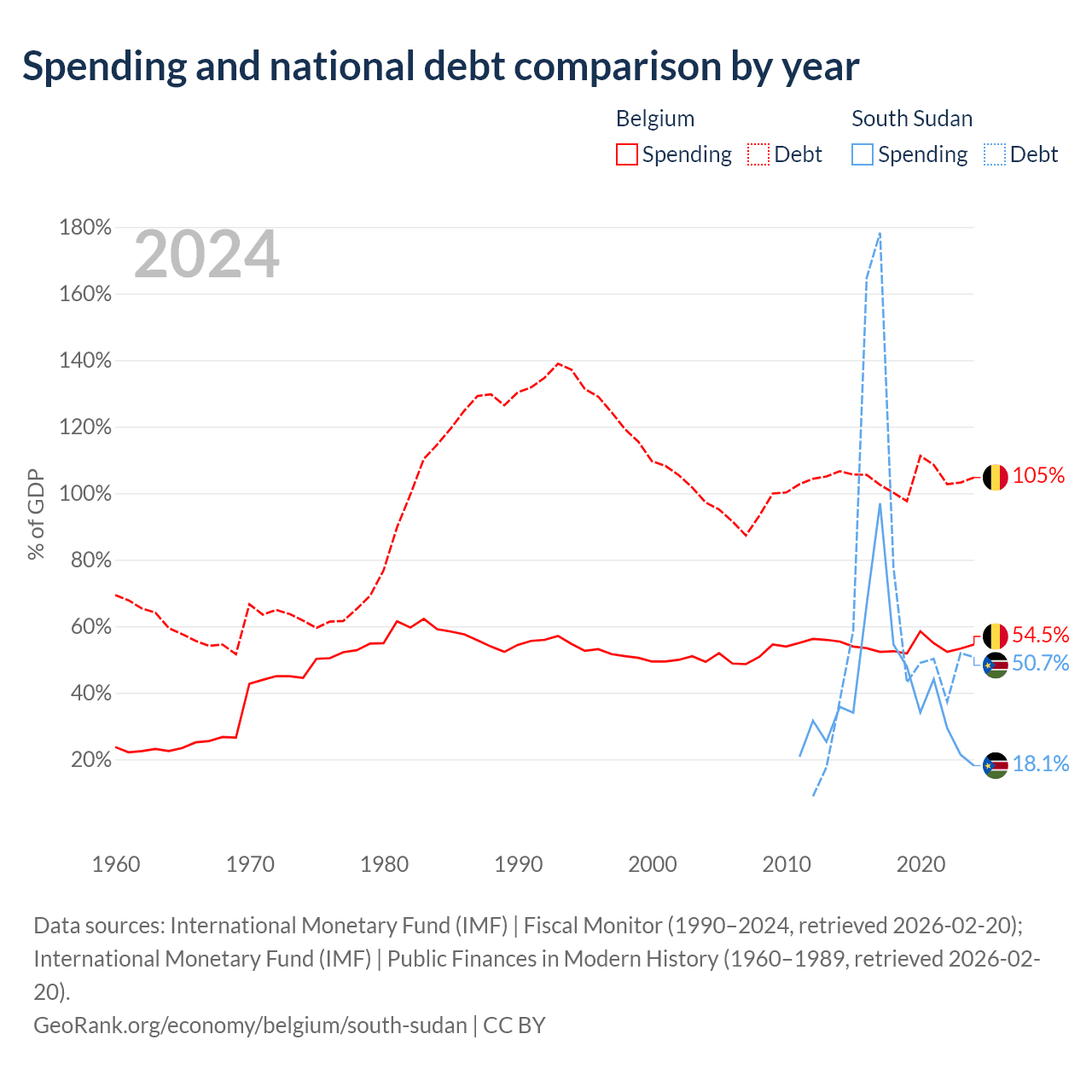 Belgium has $703B in government debt (104.7% of GDP), compared to $7.04B (50.7% of GDP) in South Sudan.