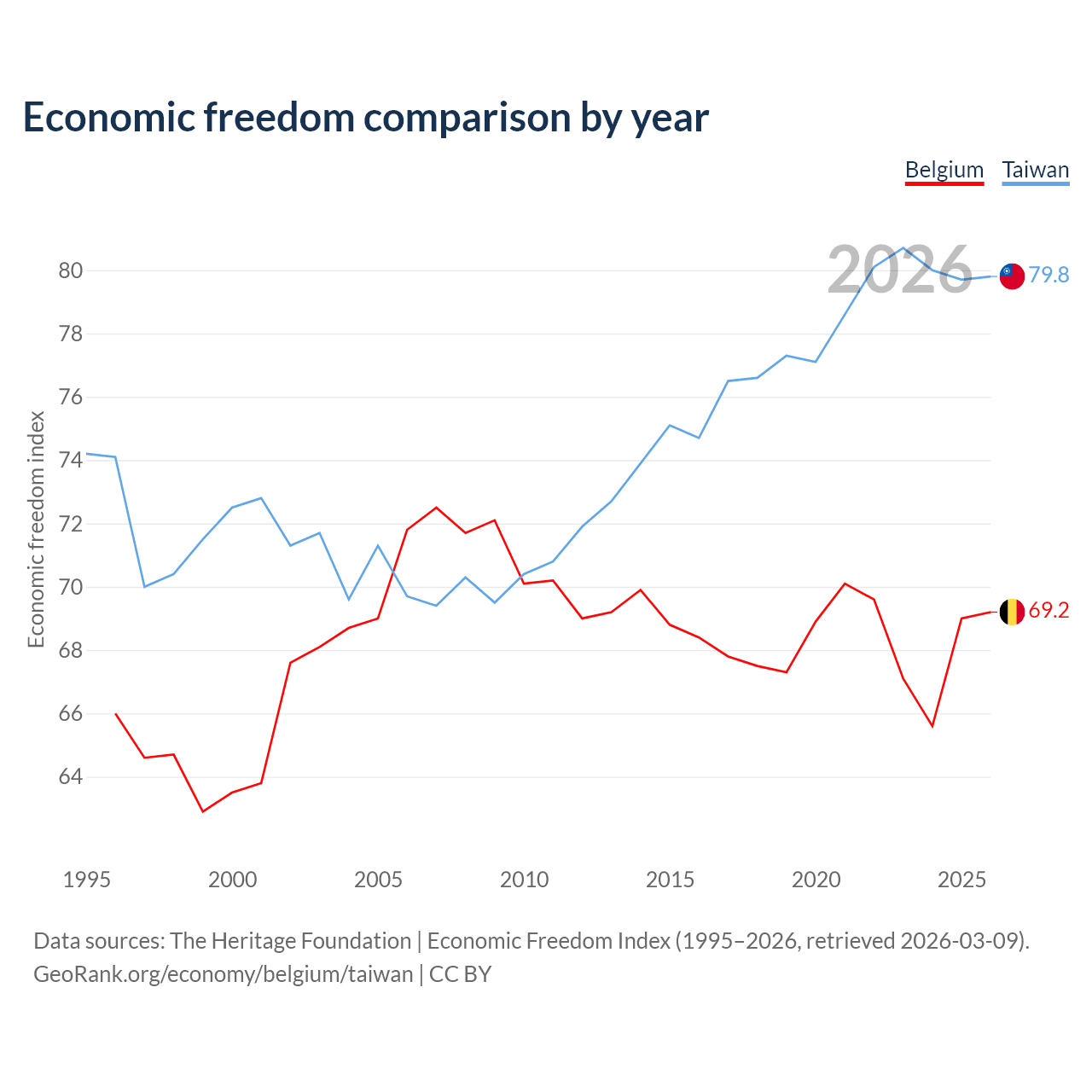 Data sources: The Heritage Foundation | Economic Freedom Index (1995–2026, retrieved 2026-03-09).