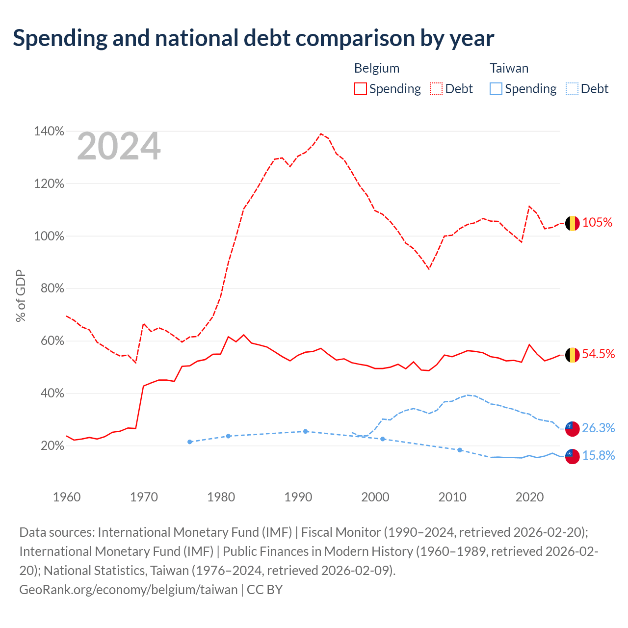 Belgium has $703B in government debt (104.7% of GDP), compared to $211B (26.3% of GDP) in Taiwan.