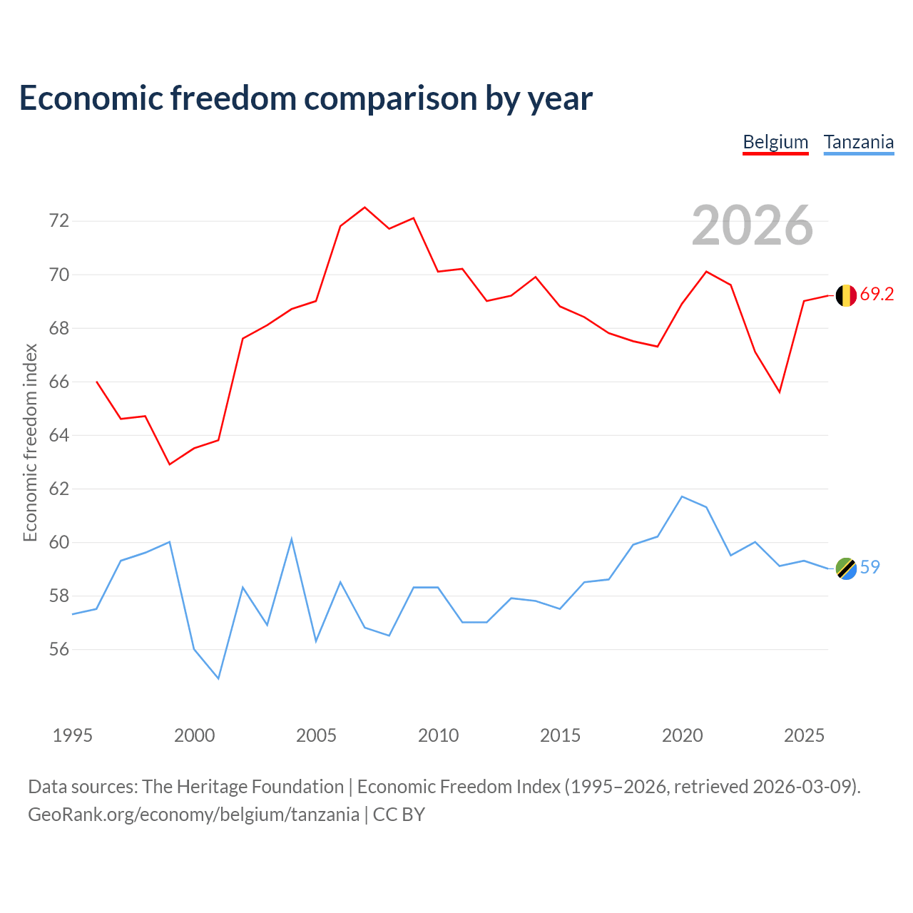 The Economic Freedom Index for Belgium is 69.2, ranking 42/197, compared to 59 for Tanzania, ranking 106/197. The chart above displays a comparison of annual changes in economic freedom indexes.