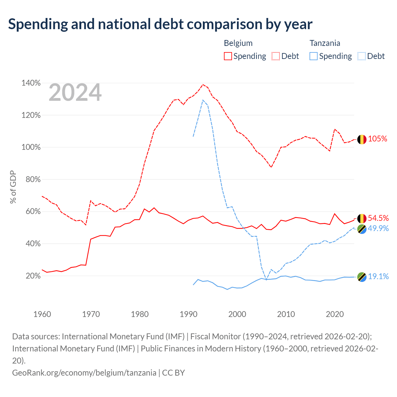Belgium has $703B in government debt (104.7% of GDP), compared to $39.3B (49.9% of GDP) in Tanzania.