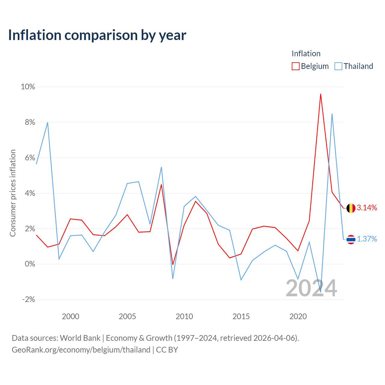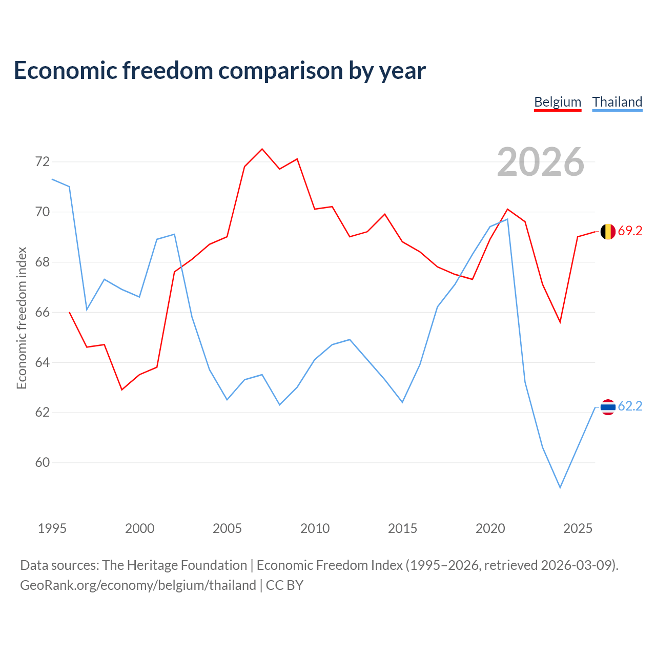 The Economic Freedom Index for Belgium is 69.2, ranking 42/197, compared to 62.2 for Thailand, ranking 88/197. The chart above displays a comparison of annual changes in economic freedom indexes.