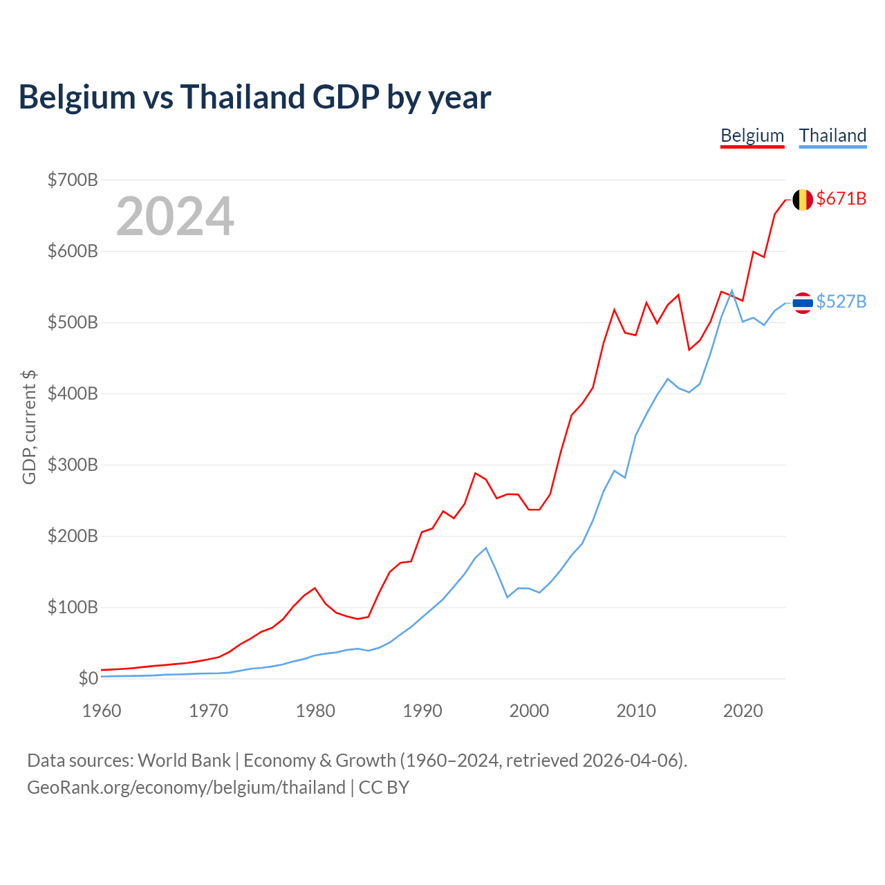 Belgium has a GDP of $671B compared to $527B for Thailand, ranking 23/197 and 31/197 by economy size, respectively.