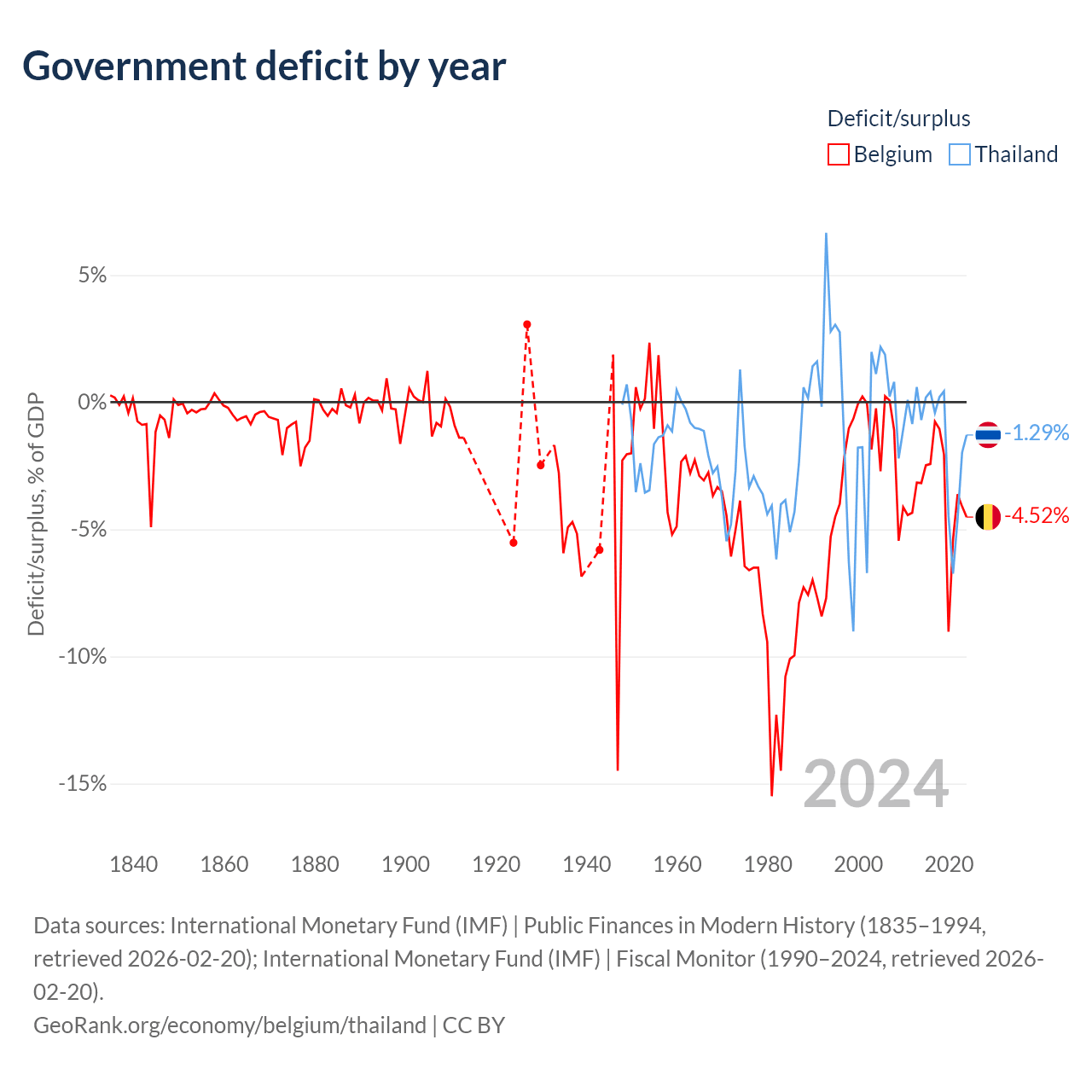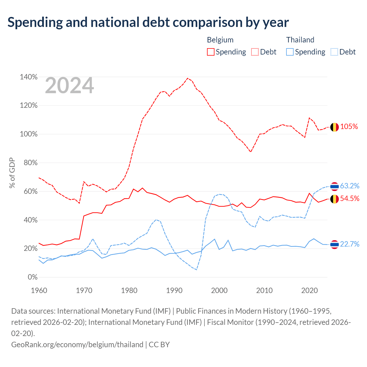 Belgium has $703B in government debt (104.7% of GDP), compared to $333B (63.2% of GDP) in Thailand.