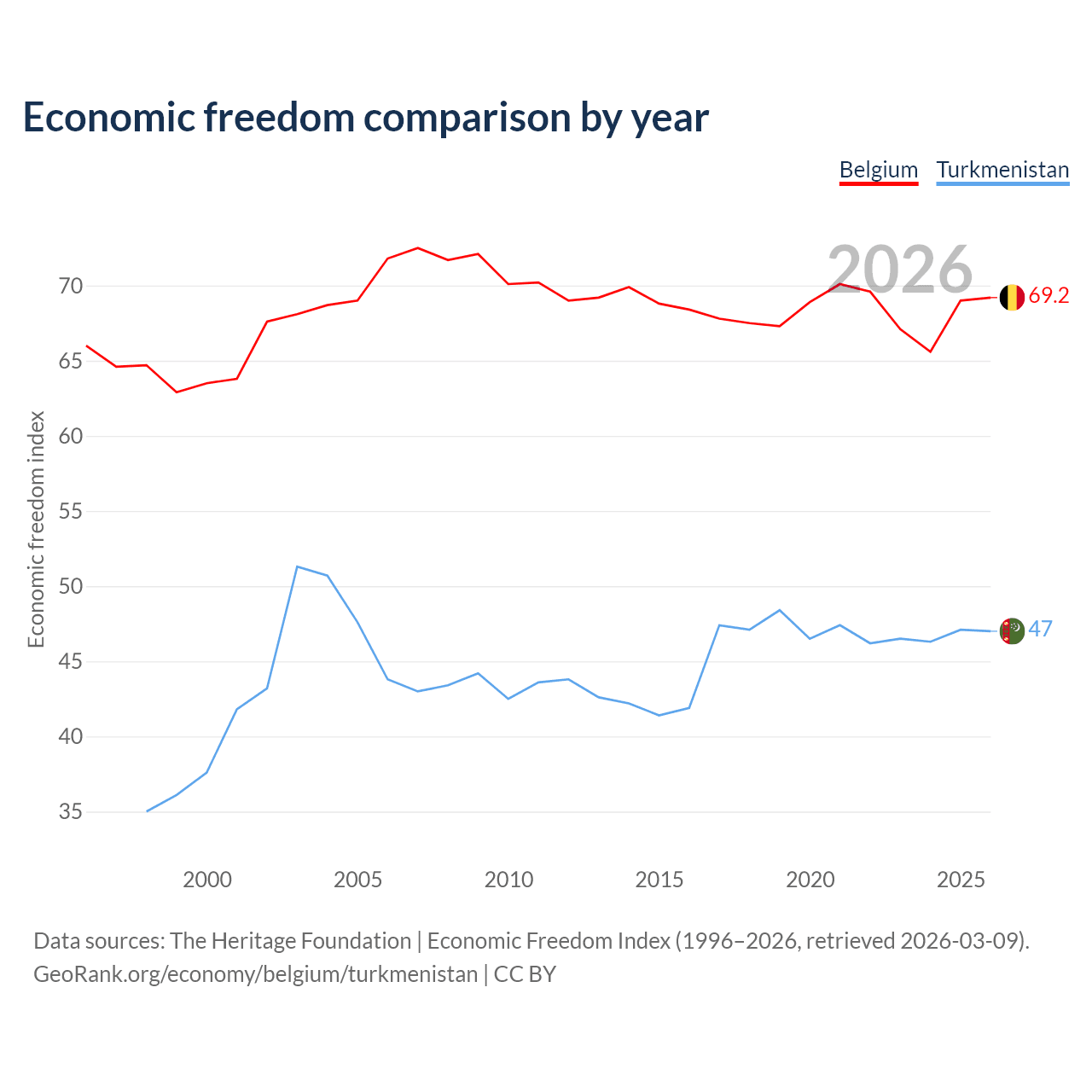 The Economic Freedom Index for Belgium is 69.2, ranking 42/197, compared to 47 for Turkmenistan, ranking 177/197. The chart above displays a comparison of annual changes in economic freedom indexes.