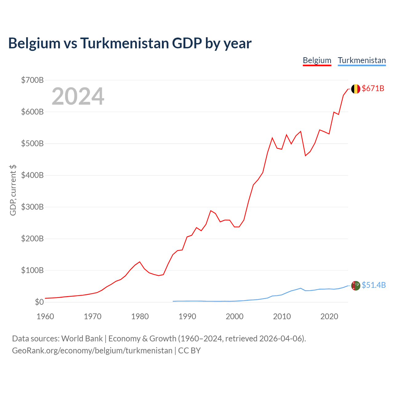 Belgium has a GDP of $671B compared to $51.4B for Turkmenistan, ranking 23/197 and 92/197 by economy size, respectively.