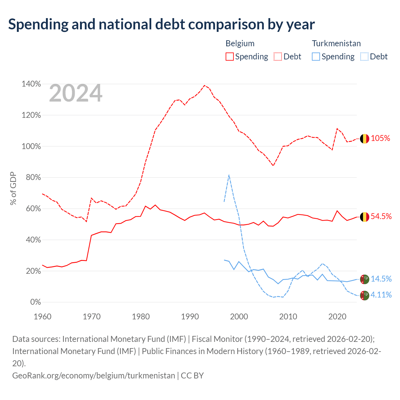 Belgium has $703B in government debt (104.7% of GDP), compared to $2.11B (4.11% of GDP) in Turkmenistan.