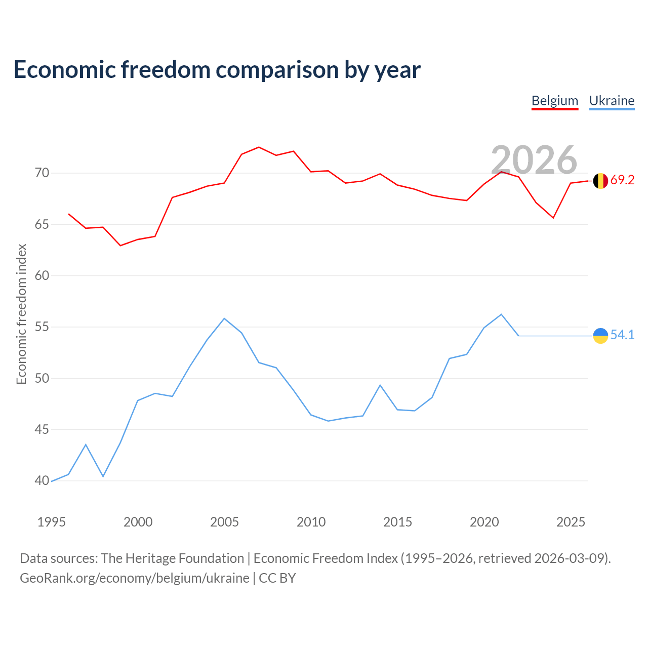 The Economic Freedom Index for Belgium is 69.2, ranking 42/197, compared to 54.1 for Ukraine, ranking 135/197. The chart above displays a comparison of annual changes in economic freedom indexes.