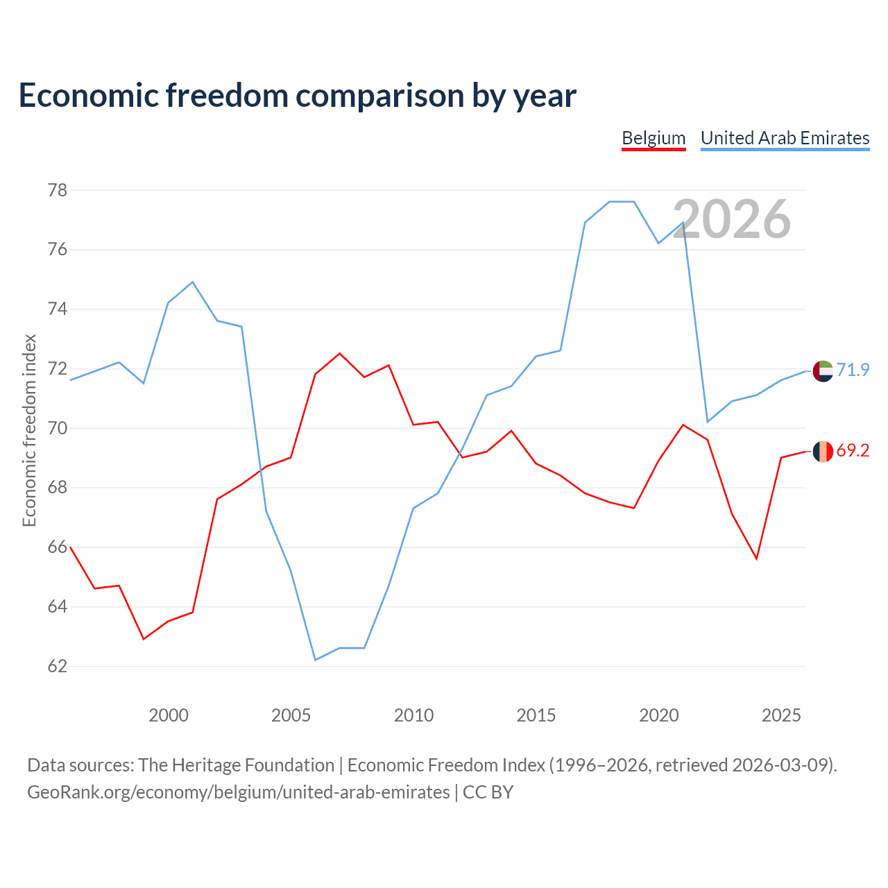 The Economic Freedom Index for Belgium is 69.2, ranking 42/197, compared to 71.9 for the United Arab Emirates, ranking 29/197. The chart above displays a comparison of annual changes in economic freedom indexes.