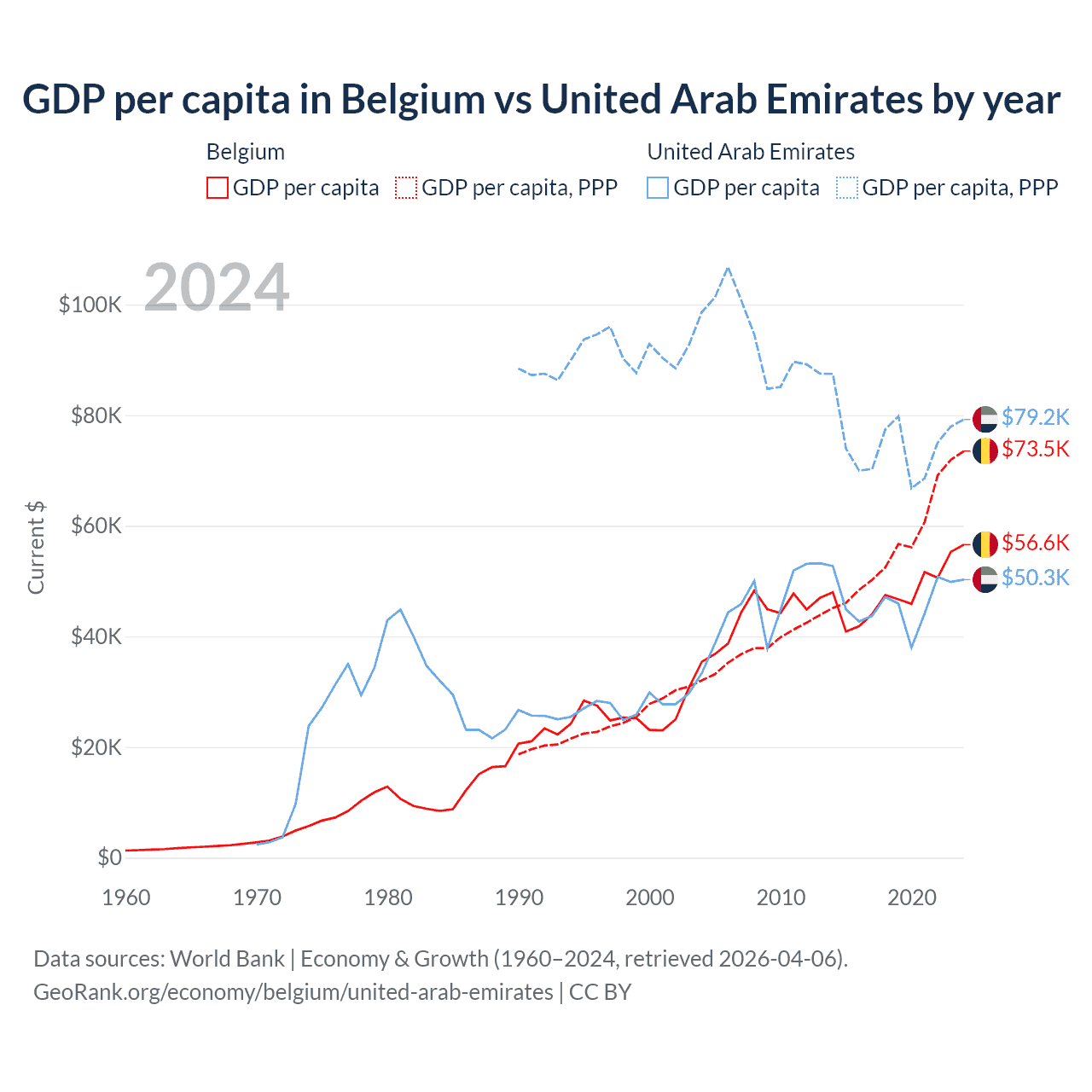 GDP per capita in Belgium vs United Arab Emirates by year