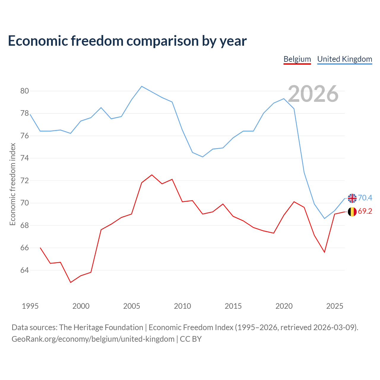 The Economic Freedom Index for Belgium is 69.2, ranking 42/197, compared to 70.4 for the United Kingdom, ranking 35/197. The chart above displays a comparison of annual changes in economic freedom indexes.