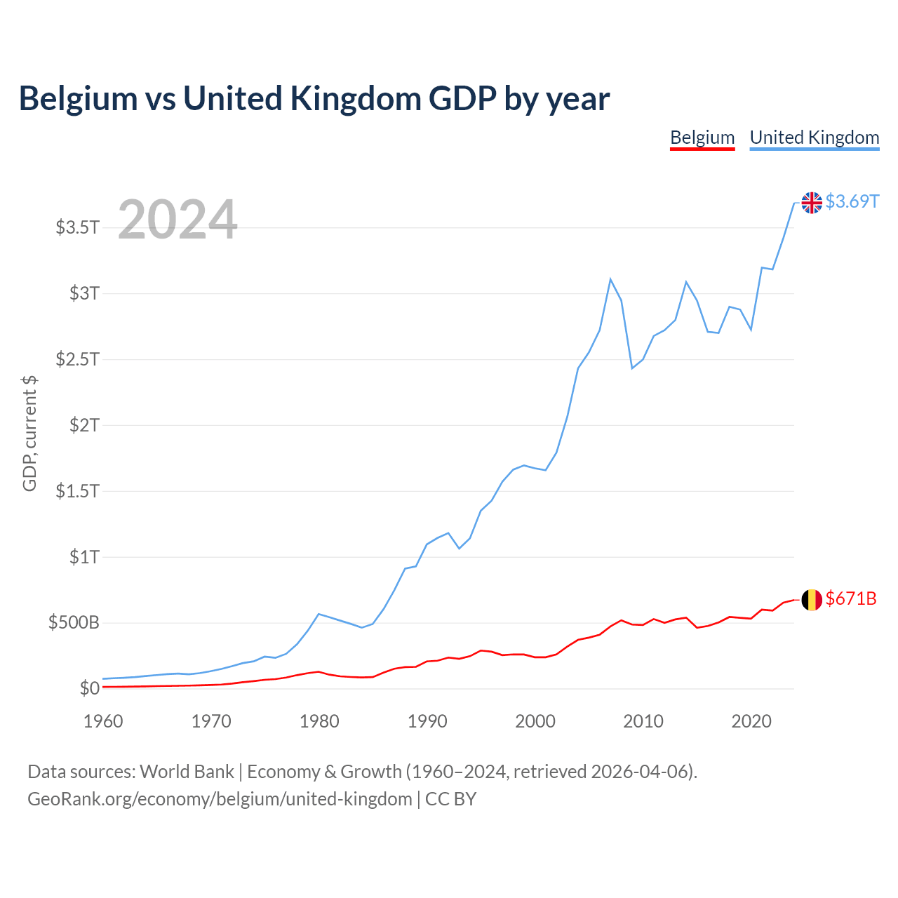 Belgium has a GDP of $671B compared to $3.69T for the United Kingdom, ranking 23/197 and 6/197 by economy size, respectively.