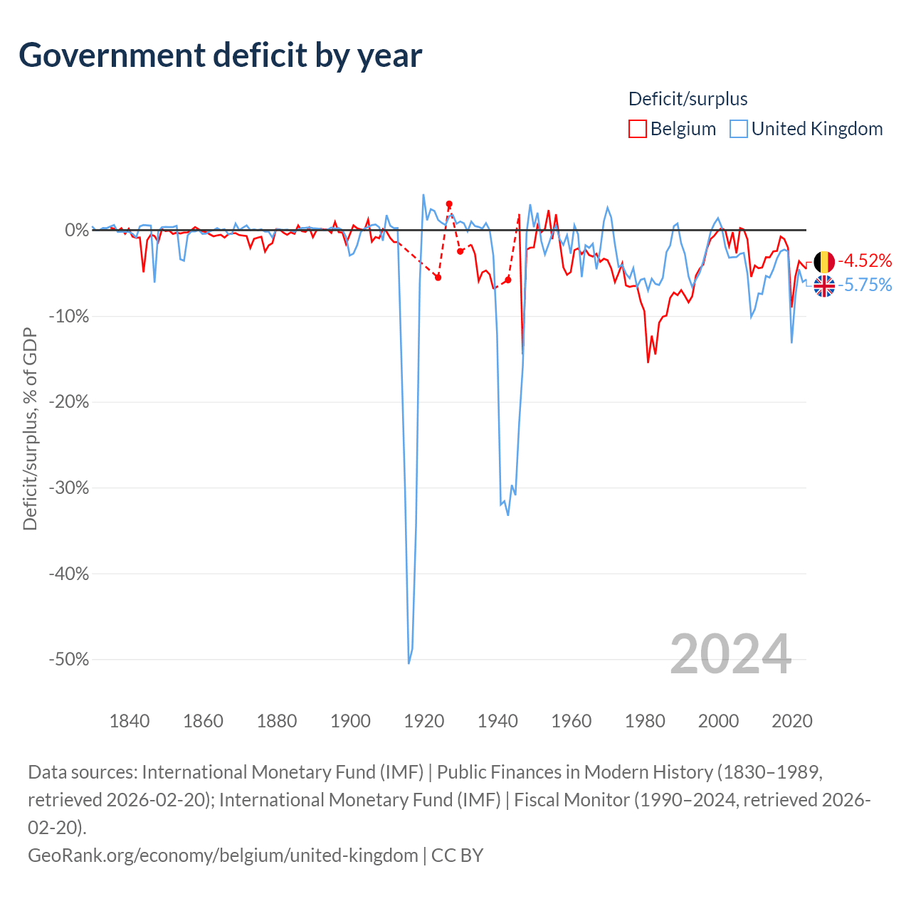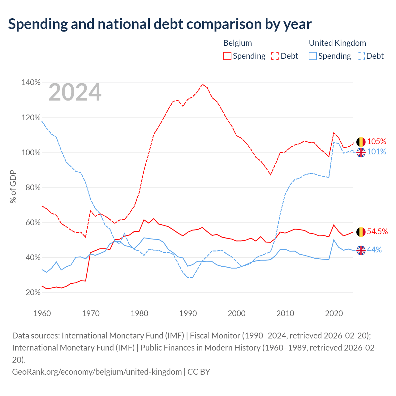 Belgium has $703B in government debt (104.7% of GDP), compared to $3.73T (101.2% of GDP) in the United Kingdom.