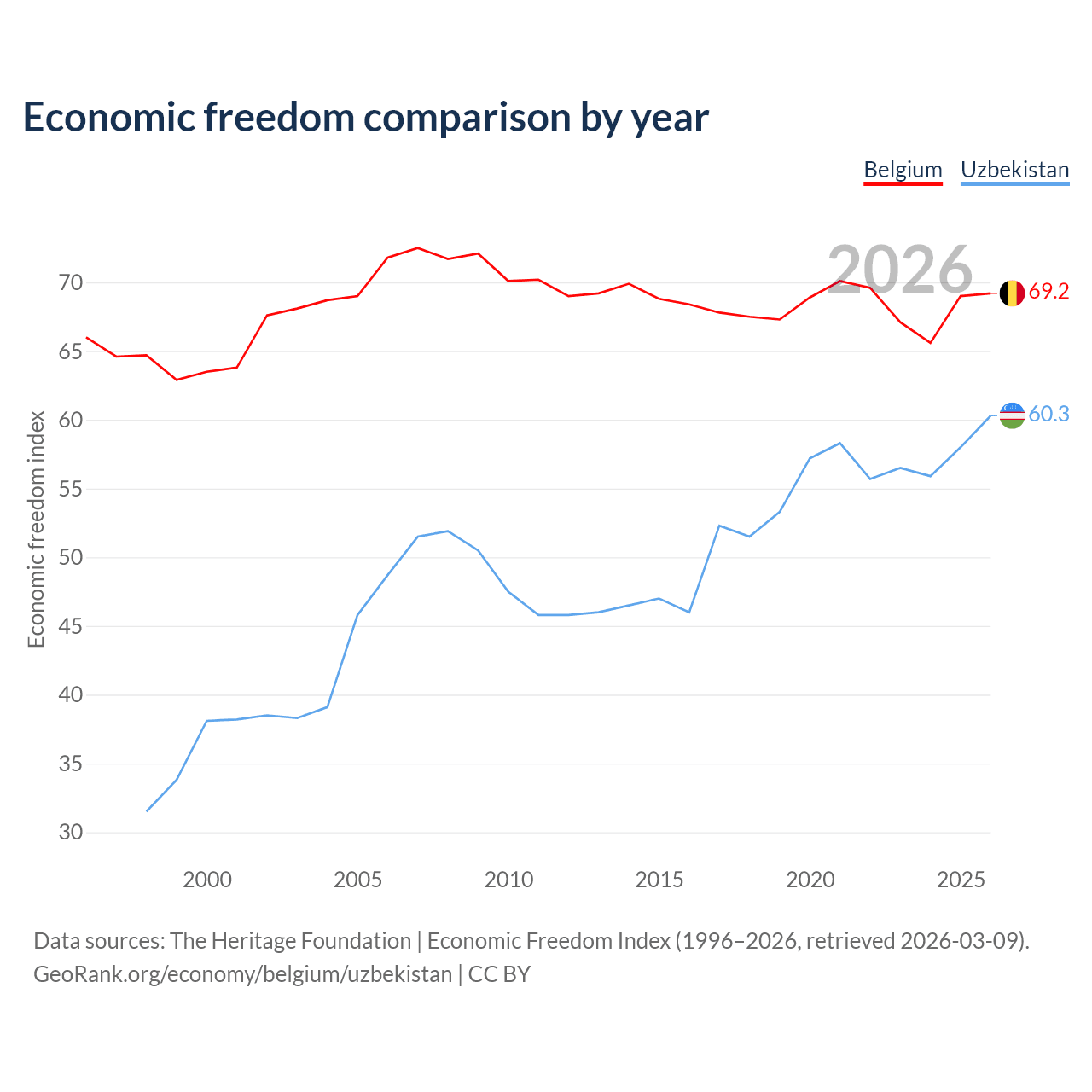 The Economic Freedom Index for Belgium is 69.2, ranking 42/197, compared to 60.3 for Uzbekistan, ranking 94/197. The chart above displays a comparison of annual changes in economic freedom indexes.