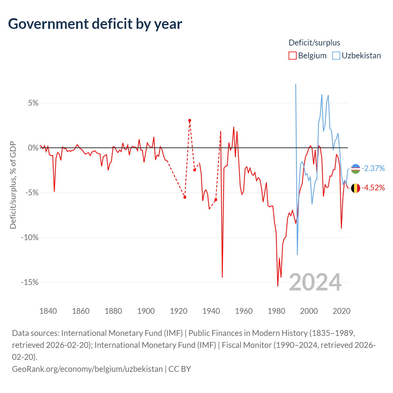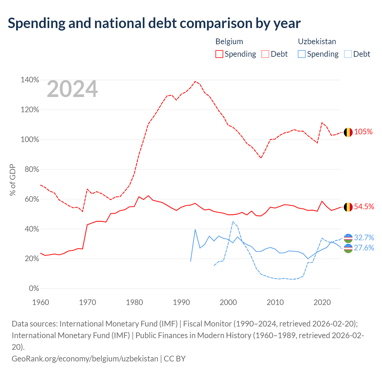 Belgium has $703B in government debt (104.7% of GDP), compared to $37.5B (32.7% of GDP) in Uzbekistan.
