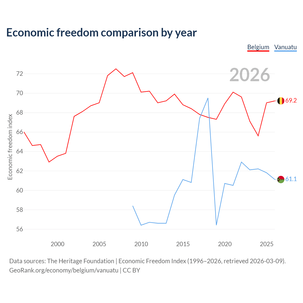The Economic Freedom Index for Belgium is 69.2, ranking 42/197, compared to 61.1 for Vanuatu, ranking 92/197. The chart above displays a comparison of annual changes in economic freedom indexes.