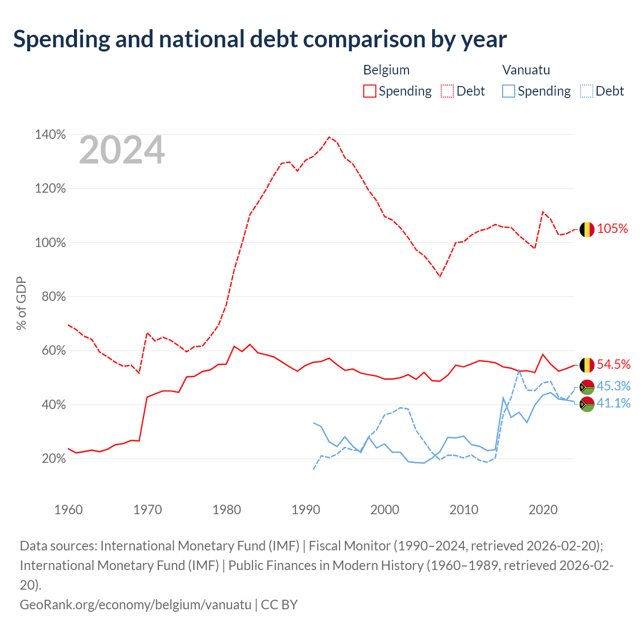 Belgium has $703B in government debt (104.7% of GDP), compared to $507M (45.3% of GDP) in Vanuatu.