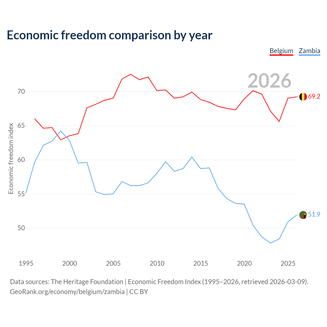 The Economic Freedom Index for Belgium is 69.2, ranking 42/197, compared to 51.9 for Zambia, ranking 152/197. The chart above displays a comparison of annual changes in economic freedom indexes.