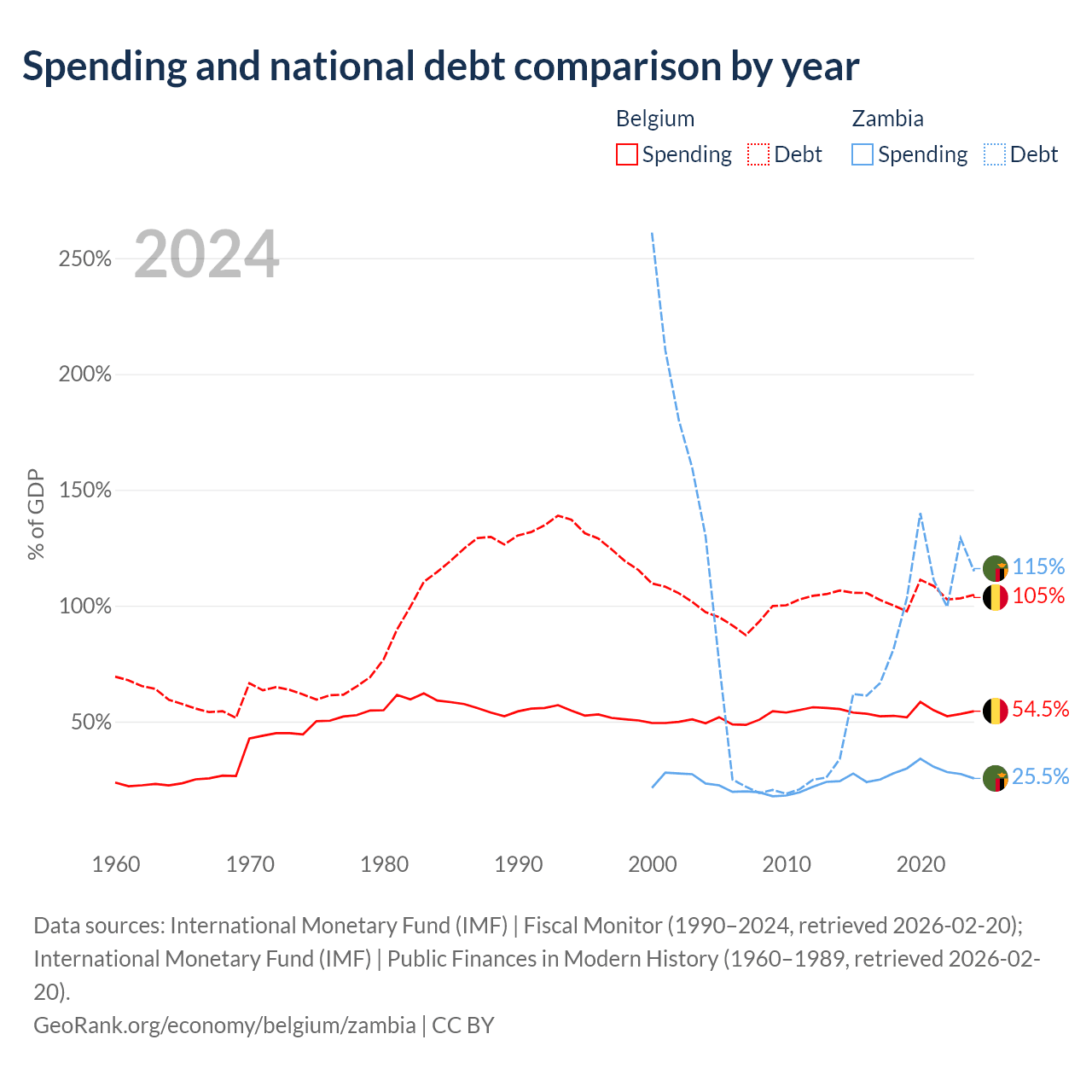 Belgium has $703B in government debt (104.7% of GDP), compared to $29.1B (114.9% of GDP) in Zambia.