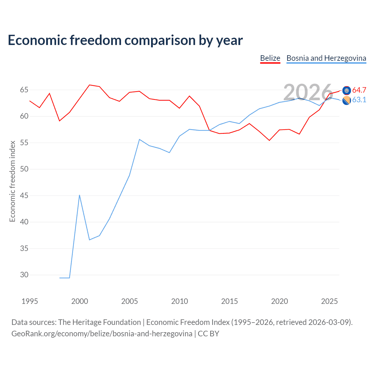 The Economic Freedom Index for Belize is 64.7, ranking 71/197, compared to 63.1 for Bosnia and Herzegovina, ranking 83/197. The chart above displays a comparison of annual changes in economic freedom indexes.