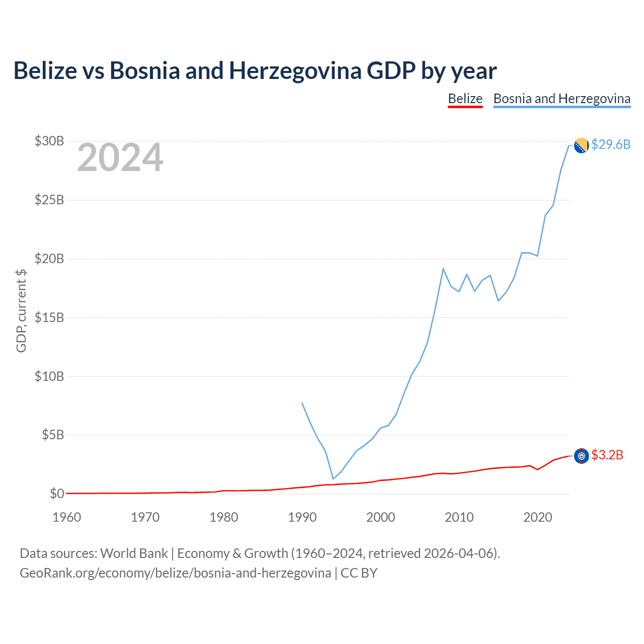 Belize has a GDP of $3.2B compared to $29.6B for Bosnia and Herzegovina, ranking 168/197 and 111/197 by economy size, respectively.
