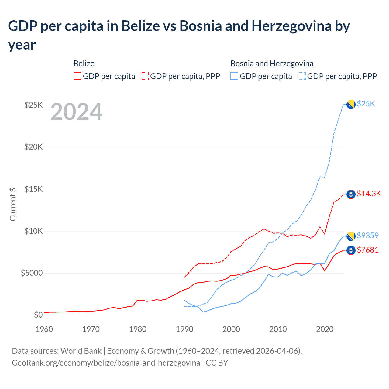 GDP per capita in Belize vs Bosnia and Herzegovina by year