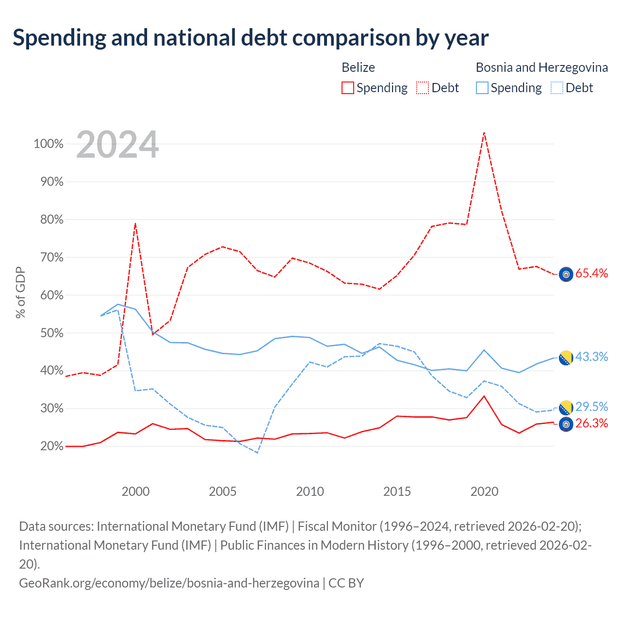 Belize has $2.1B in government debt (65.4% of GDP), compared to $8.74B (29.5% of GDP) in Bosnia and Herzegovina.