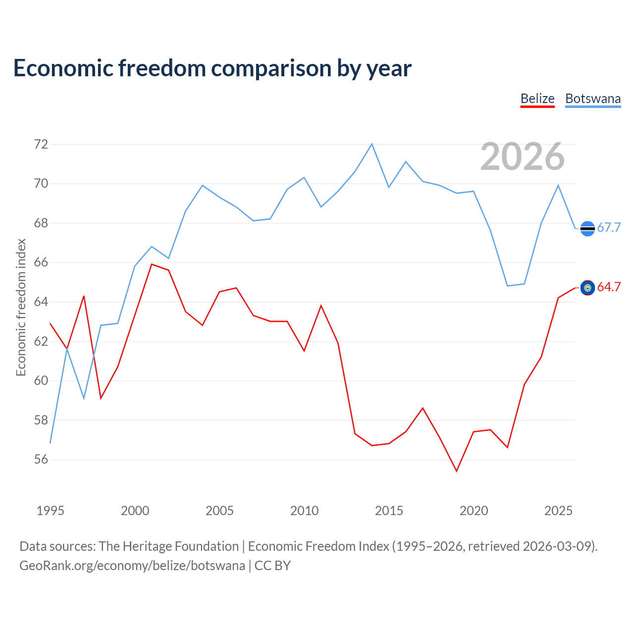 The Economic Freedom Index for Belize is 64.7, ranking 71/197, compared to 67.7 for Botswana, ranking 53/197. The chart above displays a comparison of annual changes in economic freedom indexes.