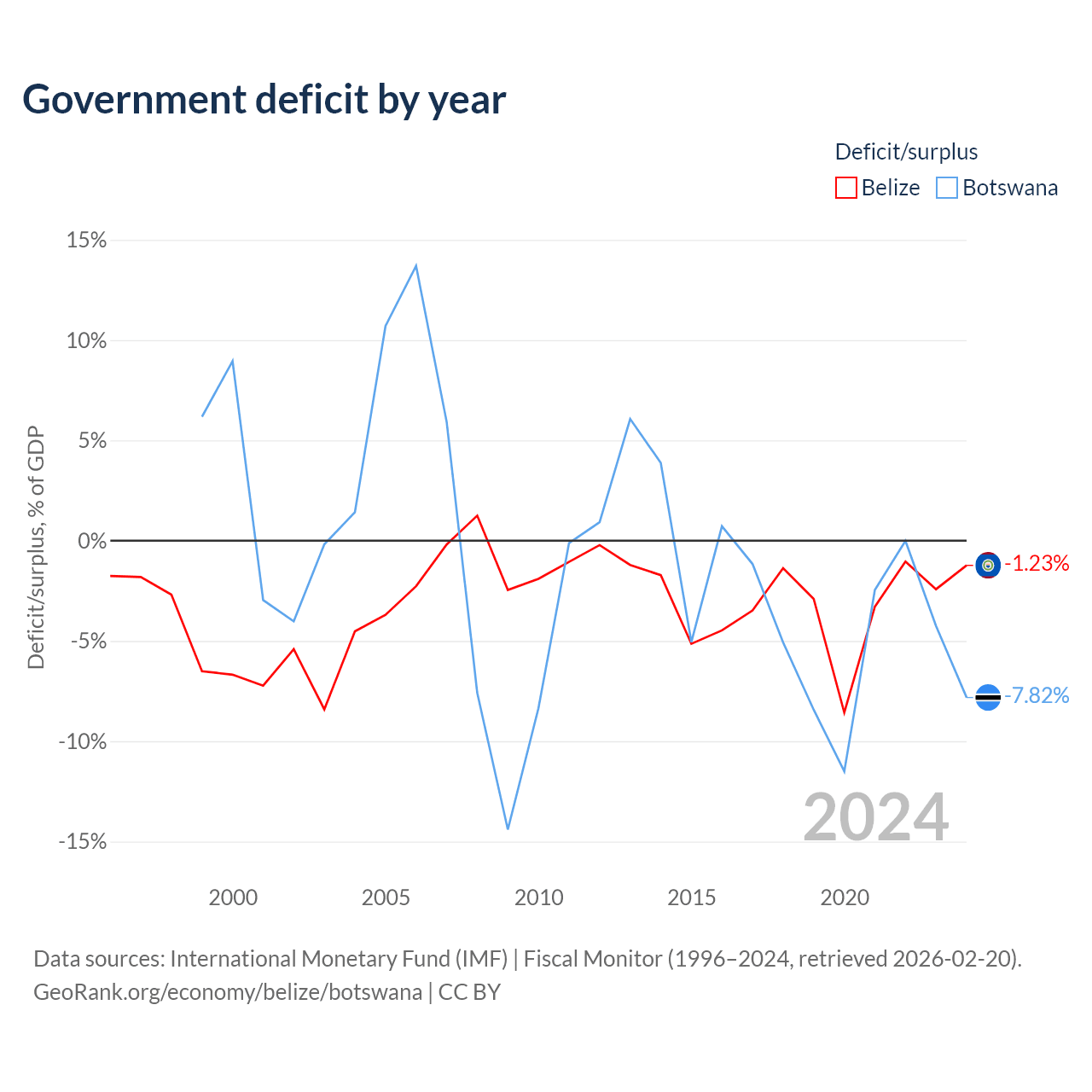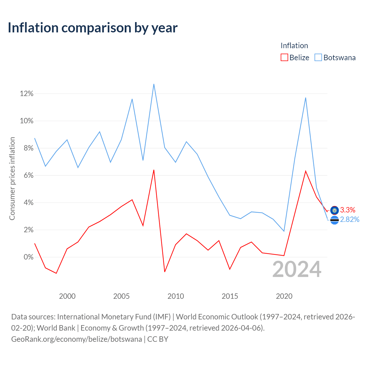 Belize has a GDP of $3.2B compared to $19.4B for Botswana, ranking 168/197 and 133/197 by economy size, respectively.