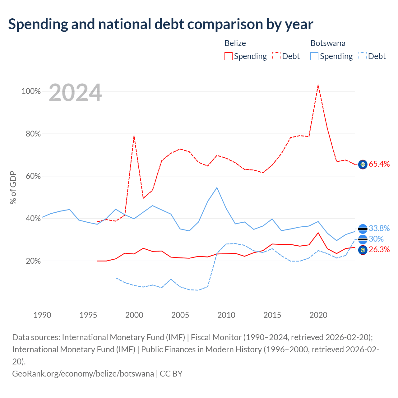 Belize has $2.1B in government debt (65.4% of GDP), compared to $5.82B (30% of GDP) in Botswana.