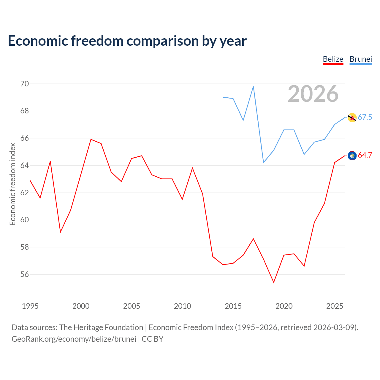 The Economic Freedom Index for Belize is 64.7, ranking 71/197, compared to 67.5 for Brunei, ranking 55/197. The chart above displays a comparison of annual changes in economic freedom indexes.