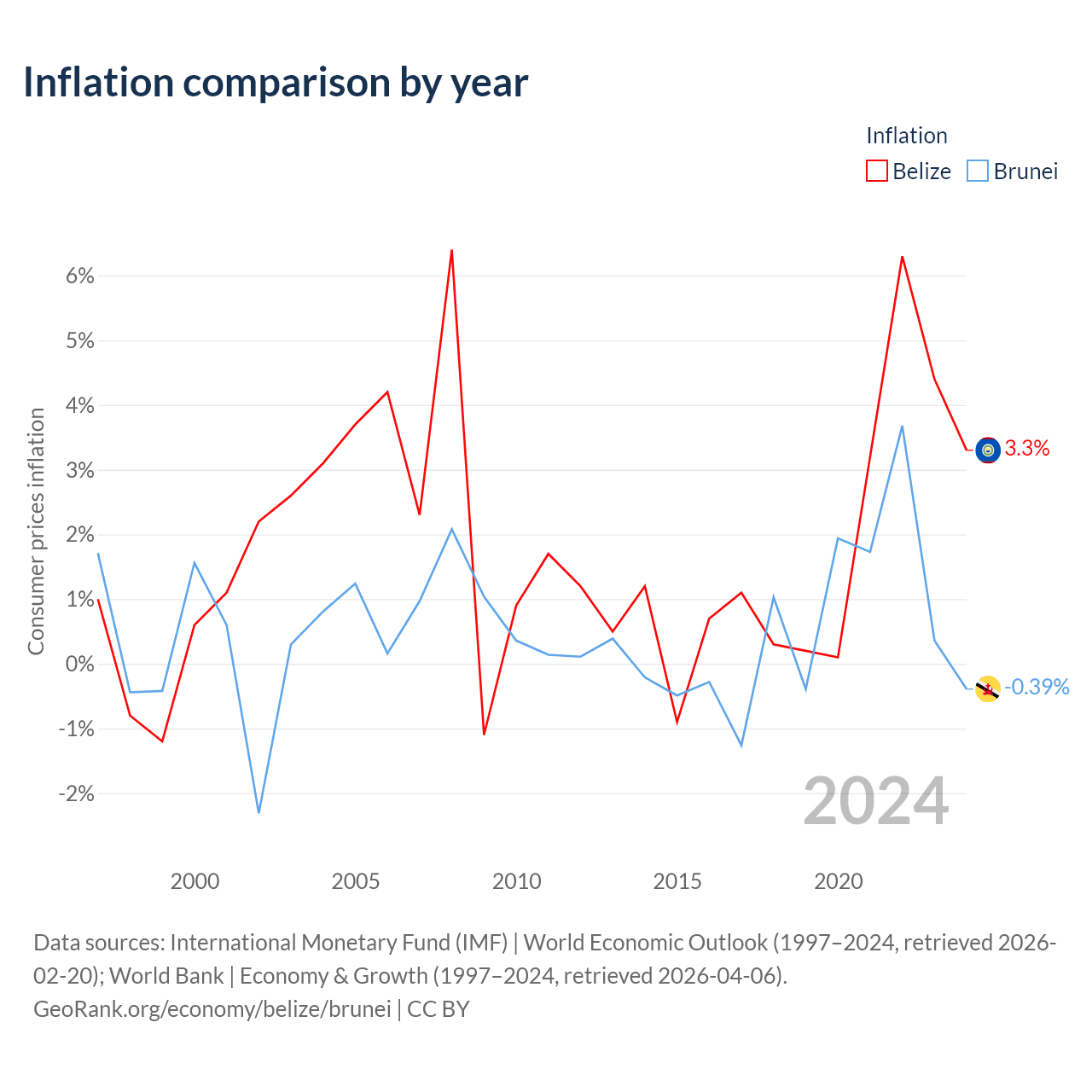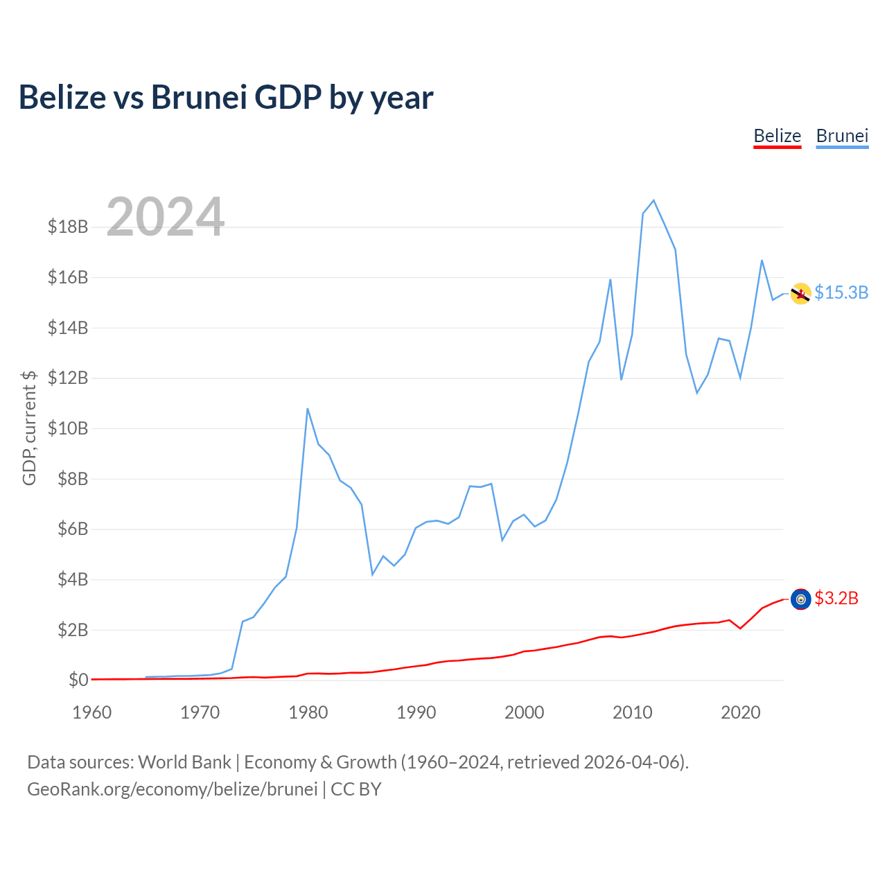 Belize has a GDP of $3.2B compared to $15.3B for Brunei, ranking 168/197 and 142/197 by economy size, respectively.