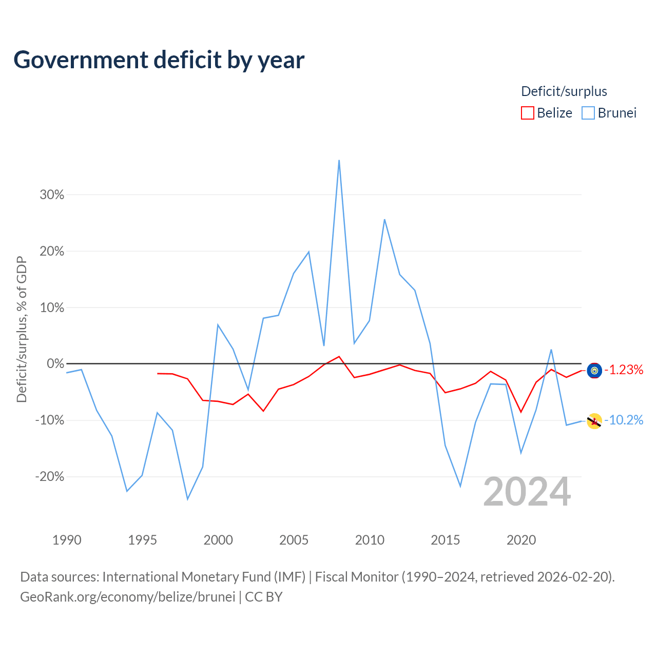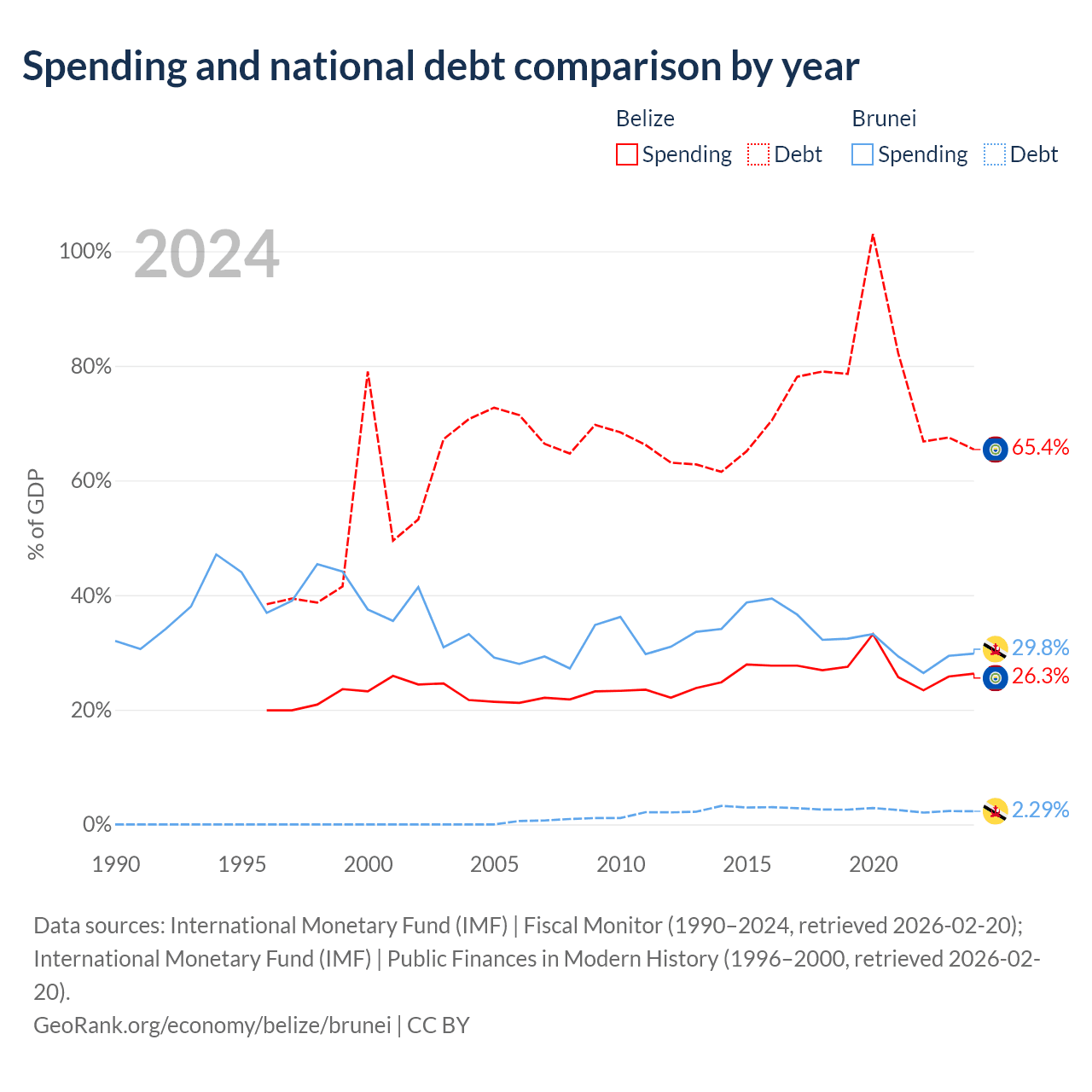 Belize has $2.1B in government debt (65.4% of GDP), compared to $351M (2.29% of GDP) in Brunei.
