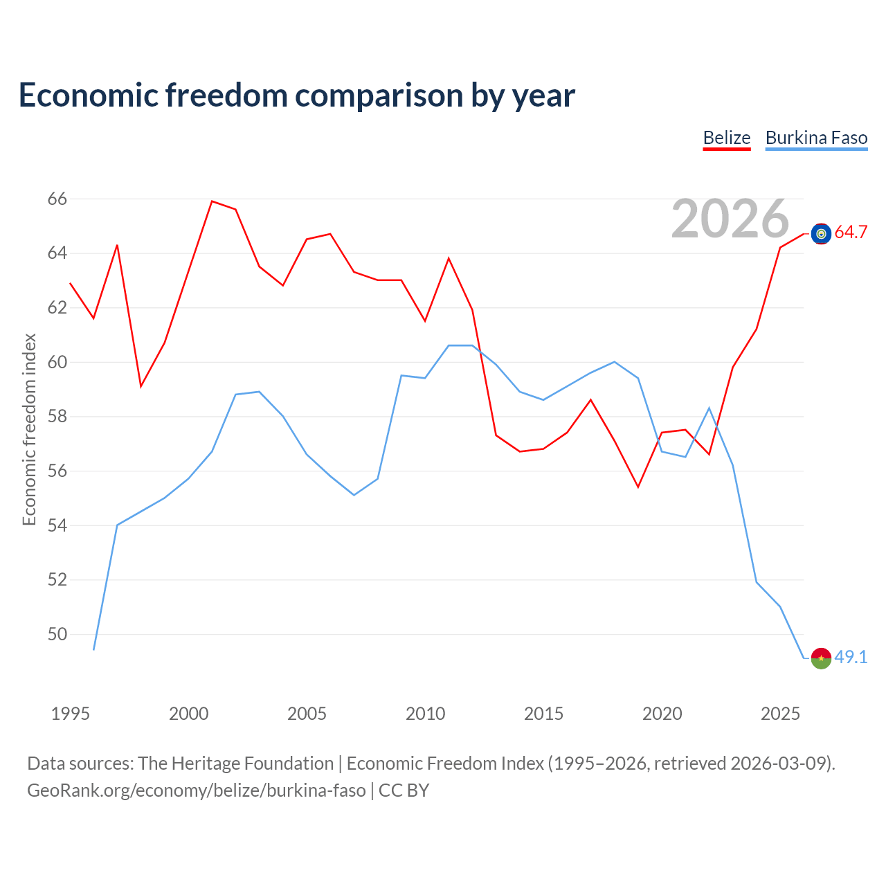 The Economic Freedom Index for Belize is 64.7, ranking 71/197, compared to 49.1 for Burkina Faso, ranking 167/197. The chart above displays a comparison of annual changes in economic freedom indexes.