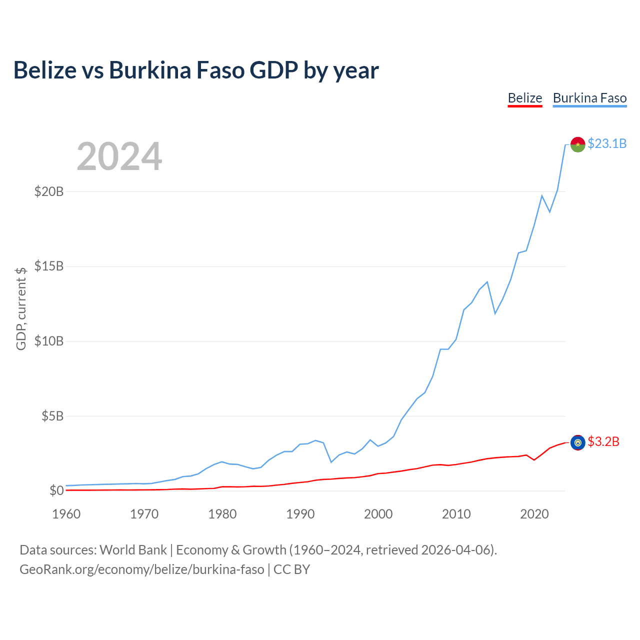 Belize has a GDP of $3.2B compared to $23.1B for Burkina Faso, ranking 168/197 and 122/197 by economy size, respectively.