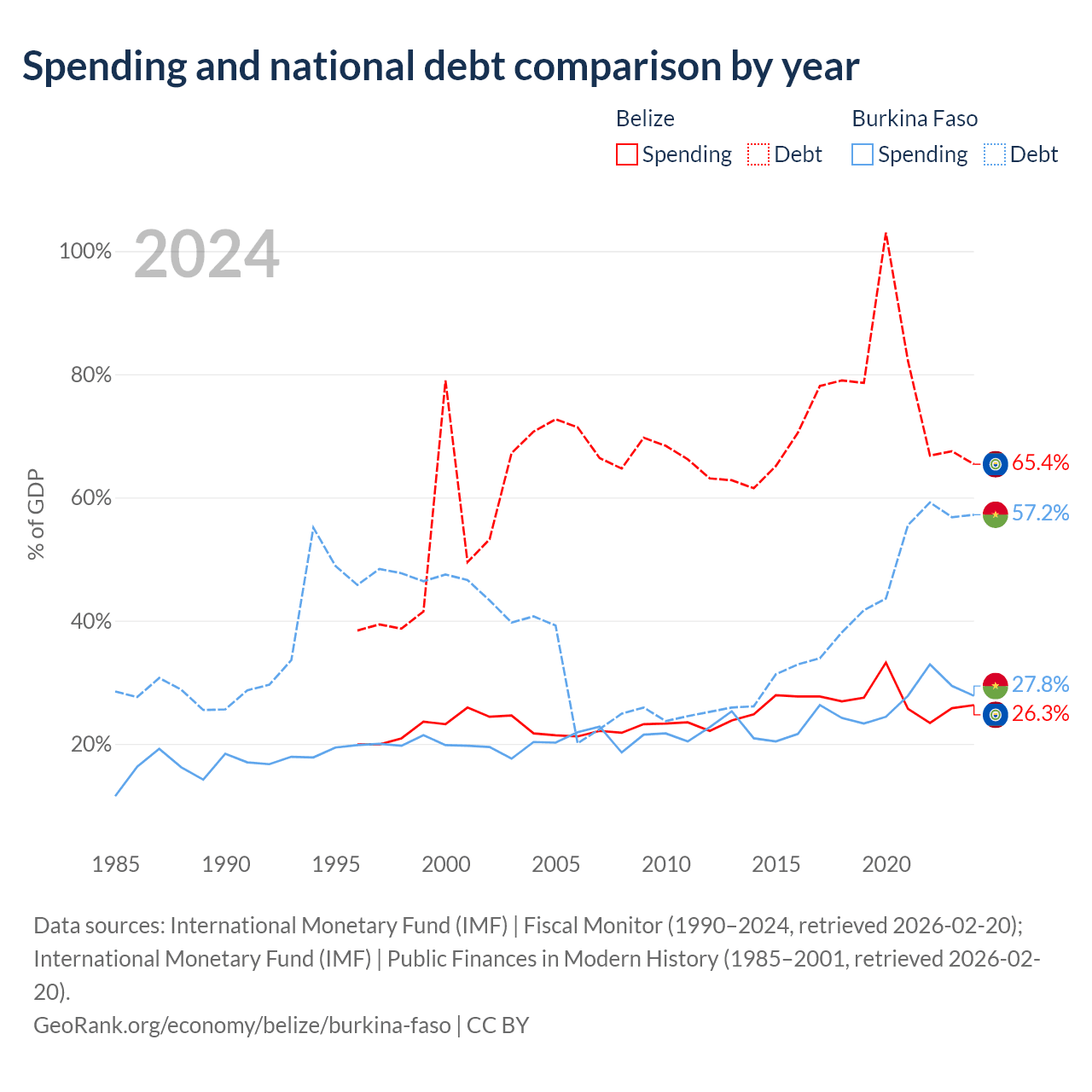 Belize has $2.1B in government debt (65.4% of GDP), compared to $13.2B (57.2% of GDP) in Burkina Faso.