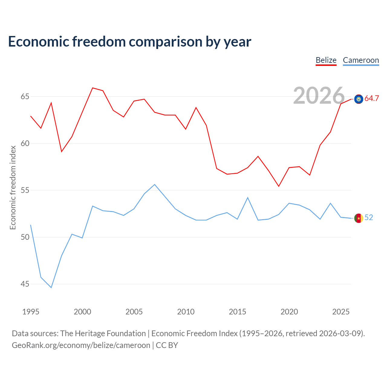 The Economic Freedom Index for Belize is 64.7, ranking 71/197, compared to 52 for Cameroon, ranking 151/197. The chart above displays a comparison of annual changes in economic freedom indexes.