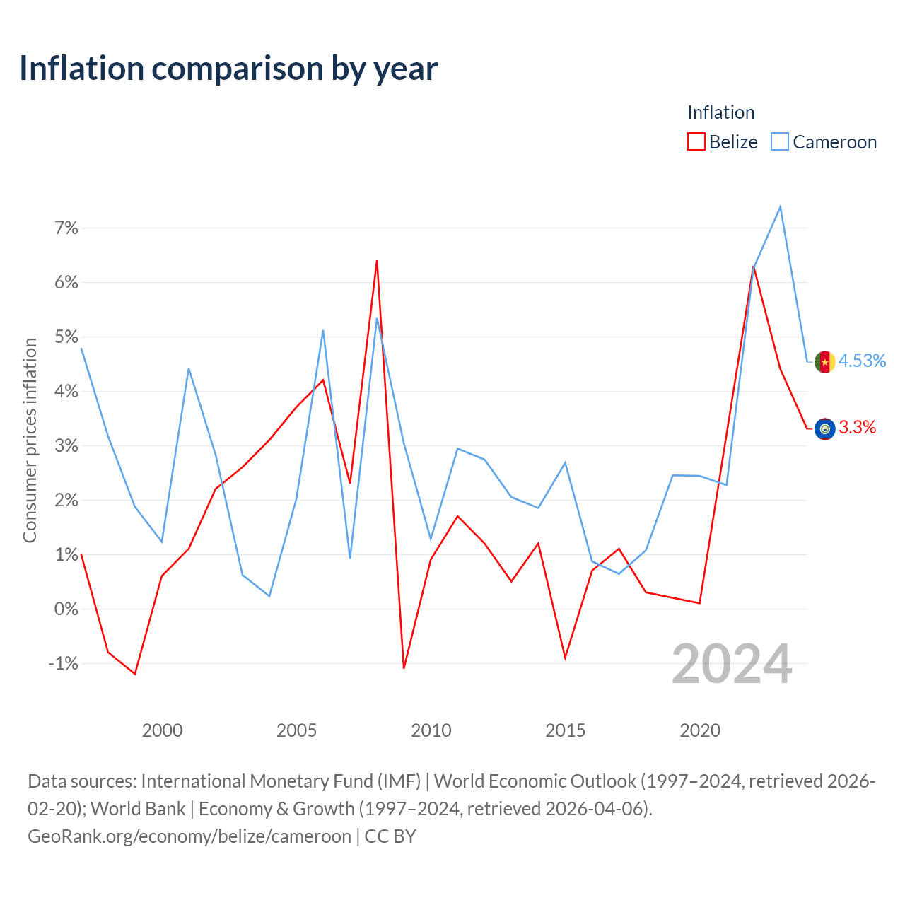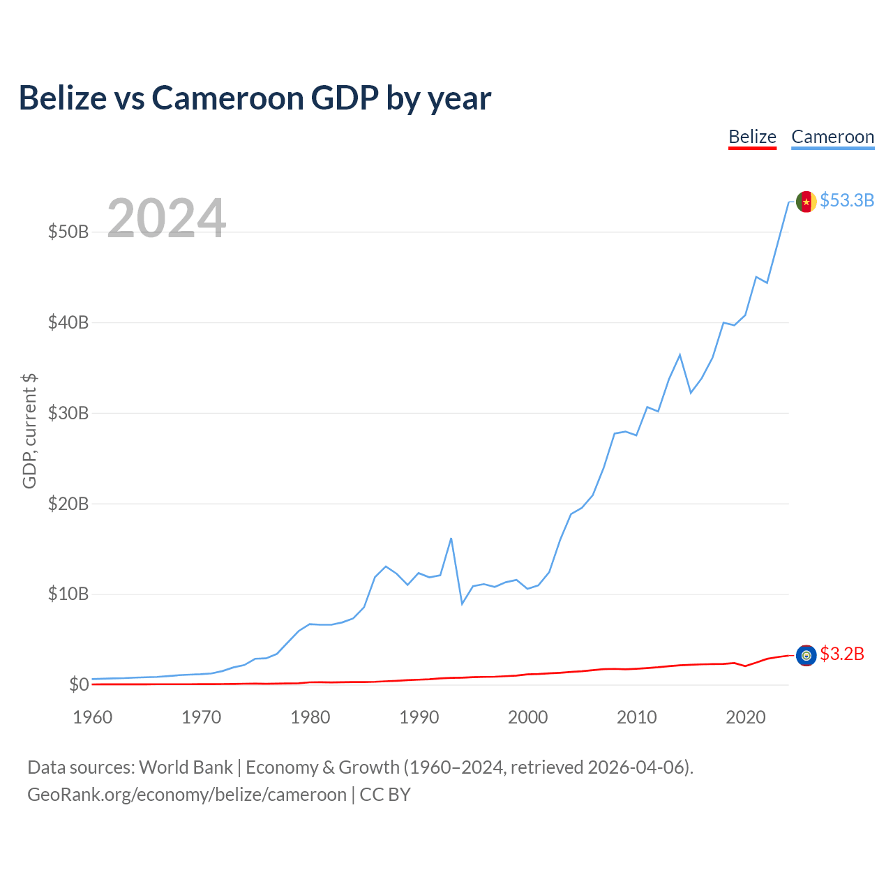 Belize has a GDP of $3.2B compared to $53.3B for Cameroon, ranking 168/197 and 91/197 by economy size, respectively.