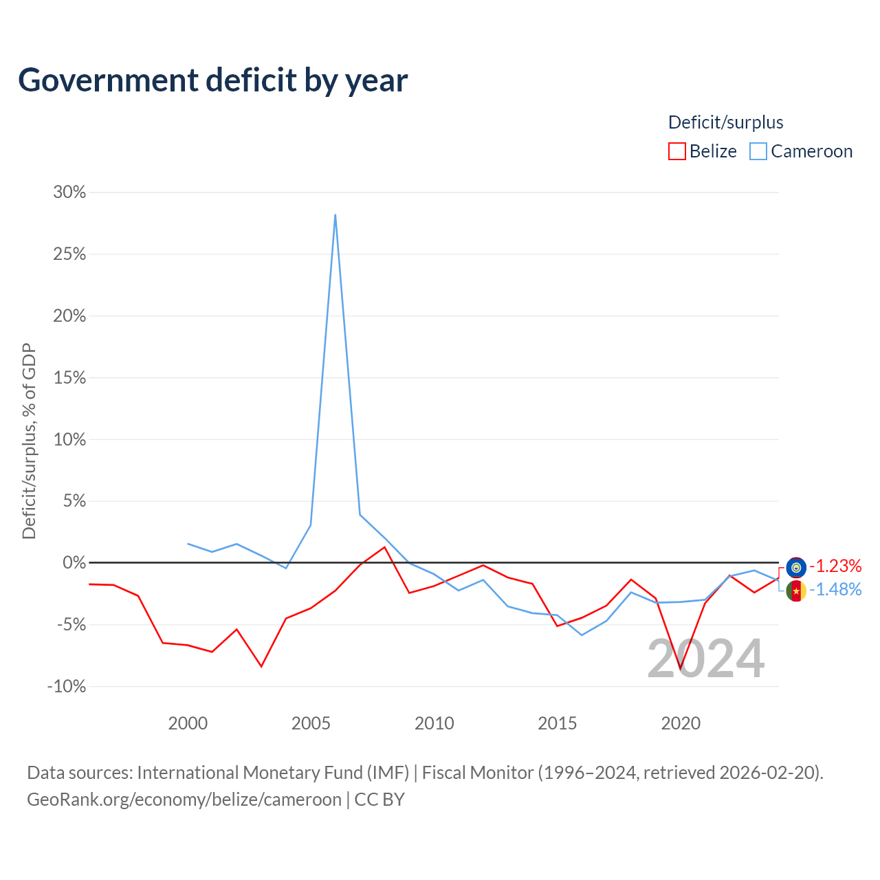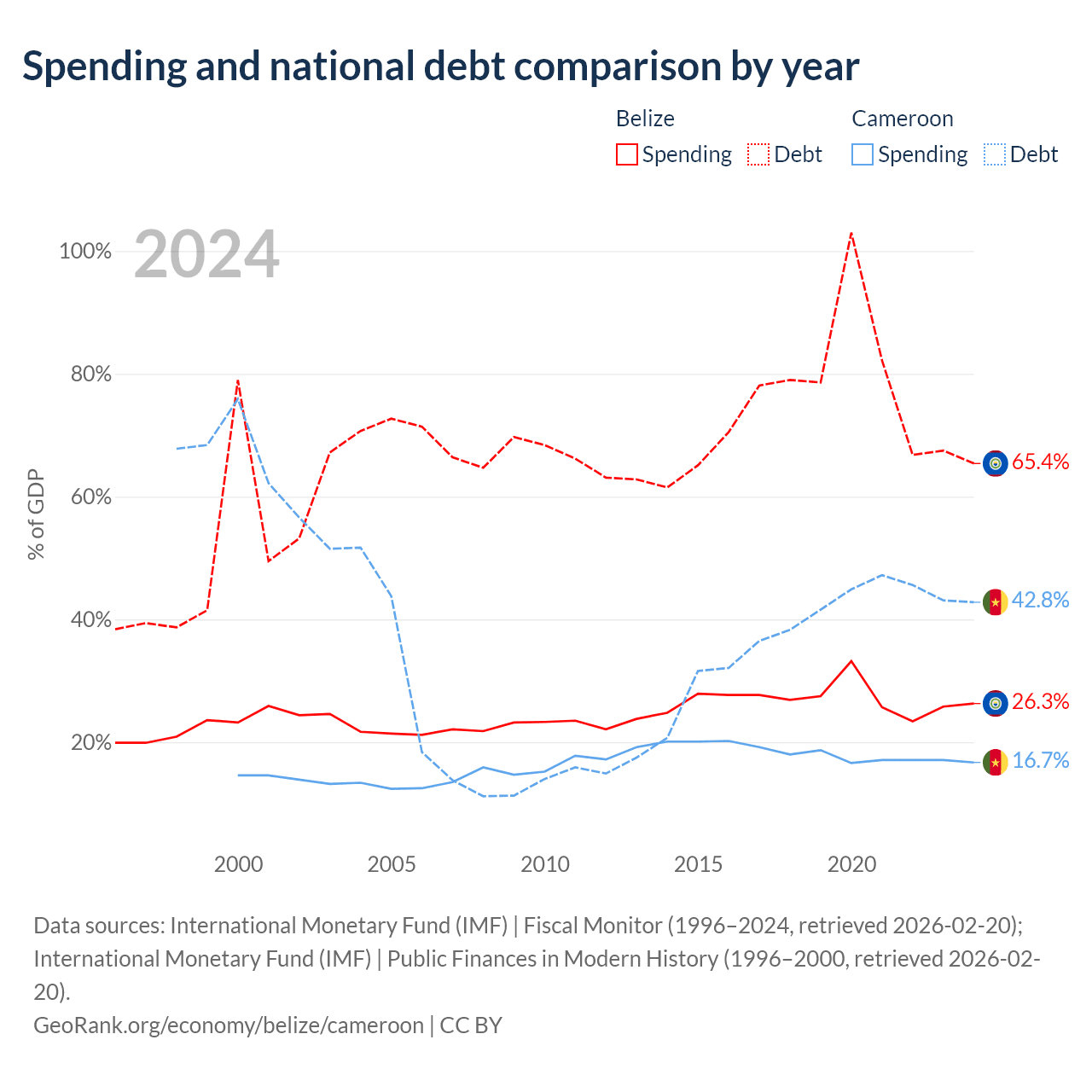 Belize has $2.1B in government debt (65.4% of GDP), compared to $22.8B (42.8% of GDP) in Cameroon.