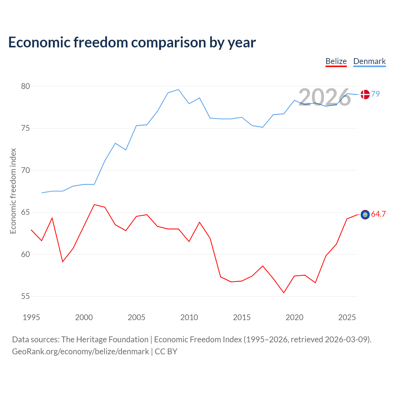 The Economic Freedom Index for Belize is 64.7, ranking 71/197, compared to 79 for Denmark, ranking 8/197. The chart above displays a comparison of annual changes in economic freedom indexes.